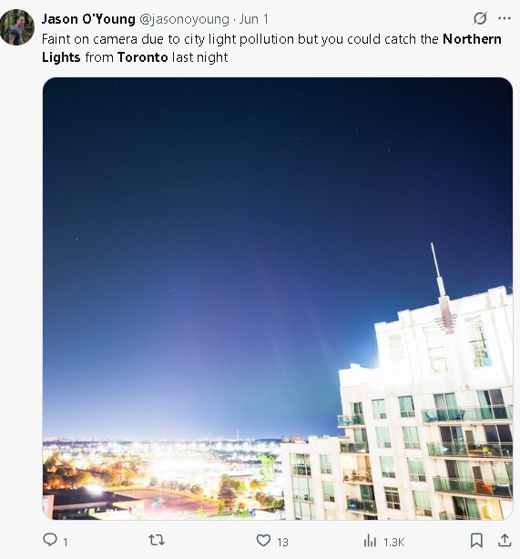 NOAA指出,除了纽芬兰、部分新斯科舍省及安省西南部外,加拿大大部分地区都在今晚的极光“可视带”之内。 ![]() 如果你处在这条“可视边界线”附近,看到极光的条件会相对苛刻,需要更加黑暗和无遮挡的环境。 此外,NOAA也表示,明天周二的晚上仍有极光活动,但可见范围将有所缩小。 昨天周日,已经有不少居民去追光了。 一位多伦多网友在市区的城市灯光污染下,依然成功捕捉到了北极光: ![]() 图源:X 为什么极光特别活跃?NOAA解释说,这次强烈极光活动是因为上周六发生了一次“日冕物质抛射”(Coronal Mass Ejection, CME)。 所谓CME,是太阳最外层日冕向太空释放出的高能等离子体和磁场风暴,当它们抵达地球时,就会在高纬度地区形成极光现象。 你会去追光吗? |