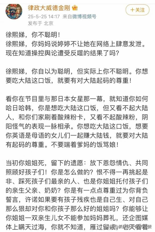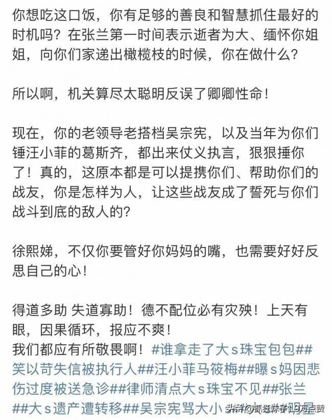 小S最近的境况可真是惨啊!自从大S去世以来,她就像失去灵魂一样,什么事都不顺利。如今想要复出?基本上没戏了! 提起这件事,就得聊聊吴宗宪。这位“嘴巴才子”最近在节目里可没消停,把小S那些往事一一翻了出来,真是让人瞠目结舌。 最狠的爆料是说她老公许雅钧都对她过去的事情感到厌烦,连两家的孩子都不愿交往。这脸打得,真是啪啪作响啊! 其实吴宗宪之所以如此狠,也是有他的原因。他女儿吴姗儒最近接手了小S的节目《小姐不熙娣》,收视率居然高于小S当时的表现!小S私底下还在想着要使小手段夺回来,这下可把护女心切的吴宗宪给惹急了。 更糟糕的是,张兰那边的律师团队紧追小S,天天在网上指责她对不起大S,连葬礼都不让亲外甥参加,更抛出什么“德不配位”“报应不爽”之类的话,真的是要把小S弄得彻底绝望啊! 最让人心凉的是,连她的老师王伟忠都不站出来帮她。前几天他参加婚礼被问到小S时,竟然轻描淡写地说:“今天的主角是新郎新娘。”这分明是在划清界限啊! ![]() ![]() ![]() ![]() ![]() 而小S妈妈的反应则是最搞笑的。小S要求妈妈晚上10点后不要上网,表示自己要“独自悲伤”。结果S妈转身就发了朋友圈:“想着我的宝贝了。”这一举动简直是和女儿对着干啊! ![]() 如今小S真是叫天天不应,叫地地不灵。复出海报都已印好,制作人却一个劲地夸赞吴姗儒的能力。要我说,这真是自作自受!在娱乐圈里混,早晚得还回来! ![]() 网友们的评论也是扎心无比: “早该凉了,天天添乱!” ![]() “吴宗宪这波操作666!” “张兰律师团队实在太给力了,继续加油!” 看来小S这次是真的摔得不能再摔了,连身边的人都不愿意帮她,这复出之路恐怕是彻底凉凉了! ![]() |