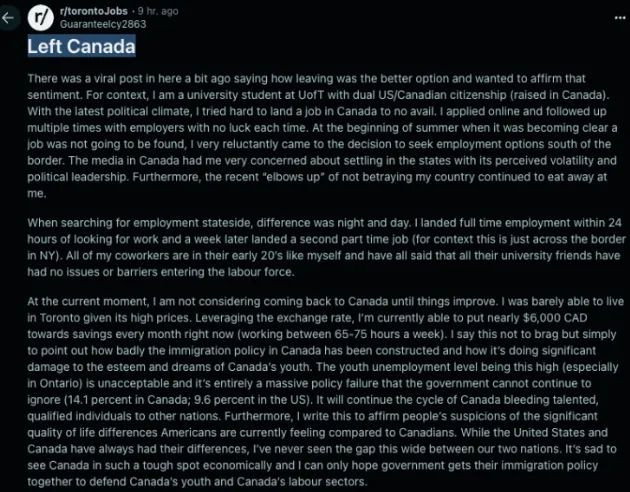 现在完全不知道该怎么办了。 在这之前,有位自称是多伦多大学的毕业生表示,在加拿大投简历石沉大海,赴美1天找到工作,每月存6000加币。 这位网友是多伦多大学的学生,拥有美国和加拿大双重国籍(在加拿大长大)。 他拼了命想在加拿大找份工作,却始终四处碰壁。我在网上投了无数份简历,还多次主动跟进,但每次都石沉大海。后来,他开始在美国找工作时,才发现两边的情况简直天差地别。我找工作不到24小时就找到了一份全职工作,一周后又找到了第二份兼职(就在纽约,离边境很近)。 现在,靠着汇率优势,他每个月能存下近6000加元(每周工作65到75小时)。 ![]() 图源:reddit 再来看多伦多的就业局势。 截至本月,多伦多的失业率已从一个月前的8.6%飙升至惊人的 8.8%。 加拿大统计局最新发布的全国劳动力报告显示,多伦多几乎在加拿大所有城市中也处于垫底位置。 只有奥沙瓦和温莎这两个普查都市区的失业率更高,分别达到惊人的 9.1% 和 10.8%(众所周知,由于拥有庞大的汽车制造业,温莎是受美国关税影响最严重的加拿大三大城市之一)。 不过,一些农村地区的数据更为严峻。 这家政府机构的一张图表显示,曼尼托巴省北部 27.2% 的劳动年龄人口目前处于失业状态,萨斯喀彻温省北部为 13.4%,纽芬兰与拉布拉多省(圣约翰斯以外地区)和努纳武特地区(伊魁特以外地区)均为 13.1%,爱德华王子岛省(夏洛特敦以外地区)为 11.1%,阿尔伯塔省北部为 11%,不列颠哥伦比亚省北部为 10.2%。 值得注意的是,加拿大统计局在编制这一特定地区表格时特别说明了其方法论,该表格显示了最新的经季节性调整的三个月移动平均失业率(依赖就业保险的居民比例)。 报告指出:"由于 2025 年 4 月 6 日至 7 月 12 日生效的一项临时措施,所有就业保险(EI)经济区域的失业率均调整了一个百分点(最高至 13.1%)。" 该机构解释称,这一调整 "确保没有任何地区的失业率低于 7.1%,而失业率达到或超过 13.1% 的地区则保留实际数值"。 按照这一不同的计算方式,多伦多的失业率被列为更令人担忧的 9.7%,在全国 62 个地区中仅次于上述地区,奥沙瓦(9.9%)和温莎(12.3%)的失业率更高。 无论参考哪一组数据,2025年5月的数据都令人极为担忧 —— 多伦多和全国许多地区每月都有数千个工作岗位流失。 在一场似乎看不到尽头的长期生活成本危机中,加拿大全国平均失业率目前为 7% 且仍在上升,这是除疫情时期外七年多来的最高水平。 而加拿大正处于经济衰退的边缘,甚至可能面临房地产市场崩溃的风险。 |