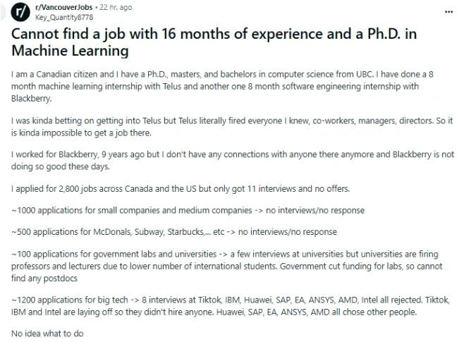 最近加拿大迎来裁员潮,联邦政府机构也不例外,先是service Canada裁员800多人,接着司法部门裁员200多人,这一切表面是归于财政资金的缩减。 但是,对于普通求职者,不涉及联邦财政资金的人,眼下也面临找工作非常困难的黑暗时刻。 一则发布在英文论坛reddit上的帖文,引起了广泛关注。 这位高学历的网友讲述了自己找工作的艰难程度,令人惊讶! ![]() 图源:reddit 以下为网友自述: 我是加拿大公民,拥有英属哥伦比亚大学(UBC)计算机科学博士、硕士和学士学位。我曾在Telus有过 8 个月的机器学习实习经历,还在Blackberry有过8个月的软件工程实习经历。 原本我挺希望能进入 Telus 工作,但实际上 Telus 把我认识的所有人 —— 同事、经理、总监都解雇了,所以现在想进这家公司几乎不可能。 我9年前曾在黑莓工作过,但现在和那里的人已经没有任何联系了,而且黑莓如今的发展状况也不太好。 我在加拿大和美国总共申请了 2800 份工作,却只获得了 11 次面试机会,且没有收到任何录用通知。