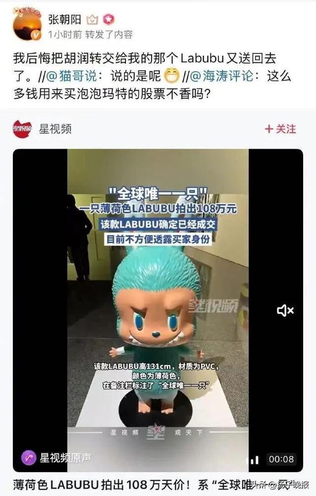 近日,“张朝阳后悔送回绝版LABUBU”的词条冲上热搜。6月15日,胡润发视频透露了这个绝版LABUBU的新去向。 视频中,胡润将LABUBU以及张朝阳送的一块半马奖牌,给了小马智行联合创始人兼CEO彭军,最终交换了一台车。 彭军说,这辆车非常有意义,是当年第一次在公开道路上自动驾驶上路载客的车,车价值30多万元,上面的激光雷达价值8万美元,加上其他配件,整车价值接近百万(元)。 在签名照片中,彭军写道:中国第一辆无人车。 4月2日,胡润发起挑战,尝试使用10块钱的手机支架换成100万,随后将这100万捐出去。“每与一位嘉宾互动后,便会将上位嘉宾送的礼品用于交换,直至交换到100万价值的礼物。”胡润在视频中解释了游戏规则。 6月8日,胡润使用一枚人造蓝宝石与泡泡玛特创始人王宁交换了LABUBU。 王宁称“这是公司最后一个”,同时在耳朵附上了签名。 ![]() ![]() 胡润抖音账号视频截图 随后,按照交换规则,这个绝版的LABUBU又到了搜狐创始人张朝阳手里,但张朝阳后续又将该玩偶送回胡润。 ![]() 胡润抖音账号视频截图 近日,LABUBU火遍全球。6月10日,一款全球唯一一只的薄荷色LABUBU在永乐2025春季拍卖会上亮相,落槌价为108万元。据了解,此次拍卖出现在全球首场初代藏品级LABUBU艺术专场。该款LABUBU尺寸为高131cm,材质为PVC,颜色为薄荷色,在备注栏标注了“全球唯一一只”。除了108万的薄荷色LABUBU外,本场拍卖还拍出82万元的棕色LABUBU,该款LABUBU全球限量15版。(此前报道:薄荷色LABUBU拍出108万天价) ![]() ![]() ![]() ![]() 胡润抖音账号视频截图 6月11日上午,永乐拍卖会消息传出后,张朝阳在社交平台转发相关新闻并写道:我后悔把胡润转交给我的那个Labubu又送回去了。 ![]() 随着LABUBU的强势出圈,泡泡玛特一跃成为全球现象级焦点。6月12日,港股泡泡玛特一度涨超5%,创历史新高。爱建证券首席投顾边风炜表示,一年半以来泡泡玛特股价回升,是因为海外分店模式成功。 |