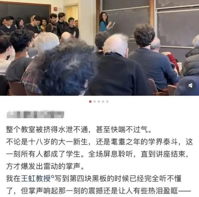 6月19日 34岁的年轻教授王虹 继续在北京大学开数学讲座 现场依旧座无虚席 北大数院研究员韦东奕 再次现身教室第一排认真听讲 这是他连续三天参加该讲座 ![]() 19日上午 北大数院硕士研究生小陈同学 告诉记者 她当天也参加了王虹老师的讲座 现场有许多外国同学来旁听 在小陈同学拍摄的视频当中 韦东奕在课间和数学爱好者们 一同围在王虹周围,交流数学问题 ![]() 据科技日报报道,5月22日,法国高等科学研究所宣布,聘请中国数学家王虹自今年9月开始担任该校数学学科终身教授。与此同时,王虹将兼任纽约大学柯朗数学科学研究所数学教授。 王虹来自广西桂林平乐县,2011年获得北京大学数学学士学位,之后进入巴黎综合理工学院学习,并于2014年获得巴黎萨克雷大学数学硕士学位。随后,她前往美国麻省理工学院攻读博士学位,并在导师拉里·古斯教授的指导下于2019年通过博士答辩。博士毕业后,王虹在普林斯顿高等研究院从事博士后研究,之后成为加州大学洛杉矶分校的助理教授。从2023年开始,她一直担任纽约大学柯朗数学科学研究所副教授。 ![]() 作为调和分析领域的专家,王虹于2022年被授予“玛丽安·米尔札哈尼新前沿奖”,以表彰她“在限制猜想、局部平滑猜想和其他相关问题方面的进展”。 ![]() 今年3月,王虹在纽约大学柯朗数学研究所的一堂课引起了关注。 教室里座无虚席,过道上、教室门口都挤满了站着听课的人,整个教室被挤得满满当当。讲台上,王虹正在分享自己的最新研究成果。 ![]() 放眼台下,有人眉头紧锁疯狂记笔记,有的人抓耳挠腮,或是一脸严肃地思索…… ![]() ![]() 有网友把这些画面做成了表情包:台下的人听着听着就懵了…… ![]() 这堂课为什么能有这么大的魅力?原来,王虹在此次研讨会上公开分享了她在三维挂谷猜想上的研究成果。这一重要成果吸引了众多专业人士和数学爱好者的目光。 ![]() 图源:网友@很饱的小c 许多听课的学生在社交媒体上发布了上课时的图片,表示这是“数学界的顶级画面”,尽管自己后面已经听不懂了,但仍屏息聆听。讲座结束后,全场爆发出热烈的掌声。 ![]() 图源:网友@NickZ 科技日报报道提到,很多学者认为,王虹是目前最有机会获得菲尔兹奖的青年女数学家之一。菲尔兹奖是数学领域的国际最高奖项之一。该奖每4年颁发1次,每次授予2至4名有卓越贡献的数学家,获奖者必须在该年元旦前未满40岁。 |