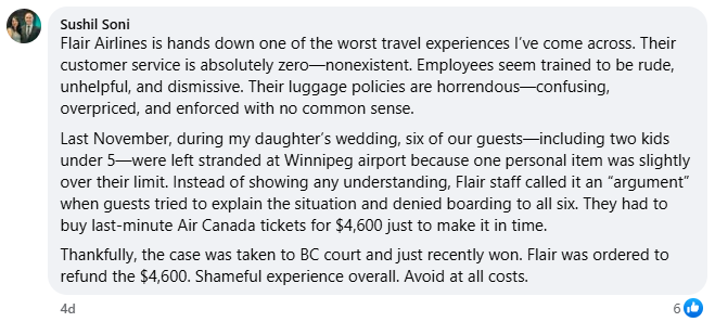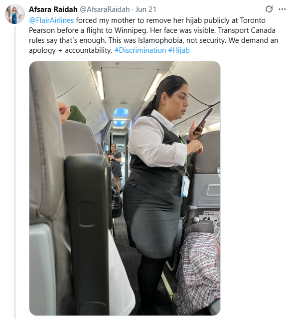 一名温尼伯女子在试图登上Flair Airlines的航班时被迫摘下头巾,她对此发声,讲述了自己的经历。Flair Airlines译为天赋航空,是加拿大一家超低成本航空公司,公司总部位于阿尔伯塔省埃德蒙顿市。 ![]() ![]() 图源:AeroMcFly220/Wikipedia 卡齐·阿明(Kazi Amin)与丈夫和孩子飞往孟加拉国探亲。在返回的航班上,她被迫在多伦多皮尔逊国际机场转机。阿明已经通过了海关检查,但她说在试图登机时被一名工作人员拦下。 阿明说:“航空公司员工拿走我的护照,看了看护照,又看了看我,说我的护照照片与本人不符,所以我必须摘下头巾。” 头巾是某些穆斯林女性佩戴的一种宗教服饰。阿明和她的丈夫试图解释,出于宗教原因不能摘下头巾,但工作人员不予理会。 阿明说她感到“屈辱”和“无助”。 “我不知道还能做什么。我在公共场合摘下了头巾……我们不允许在公共场合摘下头巾。我们只能在家人面前摘下头巾,”阿明说。 ![]() 图源:Facebook 阿明的护照照片是在2016年拍摄的,当时她还没有戴头巾。她说Flair Airlines告诉她摘下头巾是因为护照照片上的头发看起来不同。阿明的女儿阿夫萨拉·莱达(Afsara Raidah)说,这不是一个合理的借口。 “我现在是金发。我可以染回深色头发——那她是不是也要让我当场漂白头发才能登机?这说不通,”莱达说。 阿明在被要求摘下头巾时,已经通过了海关和安检。加拿大航空运输安全局(Canadian Air Transport Security Authority)的网站称,除非在安检过程中引起警报,否则乘客无需摘下宗教头巾。 指南接着指出,如果需要进行人工搜查,乘客应该可以选择在私人房间内进行搜查。阿明说她没有得到这个选择。 Flair Airlines表示,涉事员工已停职,正在进行调查。该公司表示,该员工受雇于Flair Airlines的地面合作伙伴AGI。 Flair Airlines首席执行官马西耶·威尔克(Maciej Wilk)在一份声明中说:“虽然涉事人员受雇于我们的地面服务合作伙伴AGI,而非Flair Airlines直接雇佣,但我们期望所有服务合作伙伴都能坚持我们要求自己团队达到的相同的尊重、专业和非歧视标准。” “AGI已向乘客发出了正式道歉。” 莱达说,道歉含糊不清。她将其发布在社交媒体上,以便人们可以看到,并表示她希望道歉能直接针对她的母亲。 ![]() 图源:X “还有很多其他人也经历过类似的情况,这不仅仅是穆斯林女性,”莱达说。 “工作人员应该得到适当的培训,确保他们遵守道德规范并遵循加拿大交通部的协议。” 莱达表示,她正在与律师商讨,考虑就此事对Flair Airlines采取法律行动。 她在Facebook的帖子里说道:“我的父母在加拿大居住了近30年。我们是自豪的加拿大公民。我们在这个国家旅行过很多地方,这是我们第一次经历如此明显的仇恨。” 有网友建议,也应该向加拿大人权委员会提出投诉。 ![]() 还有网友表示,Falir Airlines实在是太差劲了: “去年11月,在我女儿的婚礼上,六位宾客——包括两名五岁以下的儿童——因为一件个人物品略微超重而被困在温尼伯机场。当宾客们试图解释情况时,Flair Airlines的工作人员非但没有表示理解,反而称之为'争吵',拒绝了这六位宾客登机。为了赶上航班,他们不得不在最后一刻购买了价值4600加元的加航机票。谢天谢地,这起案件被提交到卑诗省法院,并且最近胜诉。FlairAirlines被责令退还4600加元。总而言之,这是一次令人羞耻的经历。无论如何都不要乘坐这家航空公司的航班。” ![]() 这位网友总结道:“Falir Airlines绝对是我经历过的最糟糕的旅行体验之一。他们的客户服务简直是零——完全不存在。员工似乎被训练得粗鲁无礼、冷漠无情、漠不关心。他们的行李政策糟糕透顶——令人困惑、价格虚高,而且执行起来毫无常识。” 其他不少网友也都在吐槽: “Flair的客服太差了。他们居然不让我给宝宝温奶。我家宝宝的奶不是热的,因此一路上都饿着。” ![]() “这正是我从来不坐Falir Airlines的原因。最差的客户服务,最差的体验。西捷航空和加航在专业性和可靠性方面仍然遥遥领先。” |