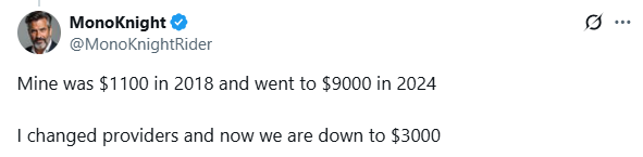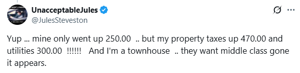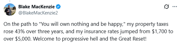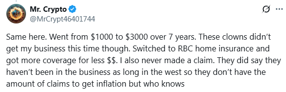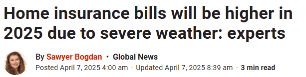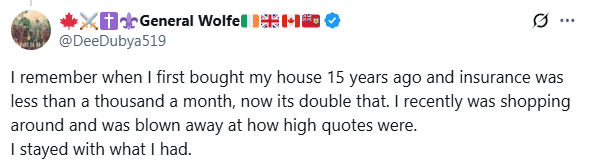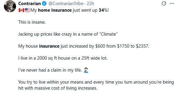 近日,一位加拿大屋主在社交媒体上吐槽“房屋保险涨得离谱”,瞬间引发海量共鸣。 这位屋主@ContrarianTribe在X晒出账单,并愤怒写道:“我的房屋保险刚刚涨了34%!这简直疯了。打着‘气候变化’的旗号疯狂涨价。我的房屋保险一下子从$1750涨到$2357,整整多了$600。我住在一栋2000平方英尺的房子里,地块宽25英尺。我这辈子从来没理过理赔。” “你努力量入为出地生活,但每次一转身,生活成本又大幅上涨。” ![]() ![]() 图源:X 帖子一出,评论区瞬间炸锅,网友纷纷晒出自己的房屋保险、地税、水电费等各种成活成本的“涨价记录”: “我也是。7年间保费从$1000涨到$3000。不过这次我没再惯着这些家伙,直接换了一家。我从未提出过索赔。” ![]() “我还记得15年前刚买房的时候,房屋保险每年不到$1000,现在已经翻倍了。最近我试着比价,结果被那些高得离谱的报价吓到了。最后我还是选择继续用原来的保险公司。” ![]() “我2018年的保费是$1100,到了2024年涨到了$9000。后来我换了保险公司,现在降到了$3000。” ![]() “我的地税三年内上涨了43%,房屋保险费更是从$1700美元飙升到$5000多。” ![]() “我的保险费只涨了$250加元,但地税涨了$470,水电费又涨了$300!!!我住的是联排别墅,看样子他们就是想逼走中产。” ![]() “地税更离谱,如果你最终还是得为自己房子底下的土地交‘租金’,那还要房贷干什么?这根本没完没了。现在回头看,房贷就像一个骗局——依我看,还不如干脆租房住。” ![]() “真的不是开玩笑,我们这几年的地税涨了差不多50%。” ![]() “3年涨了60%。” ![]() “我家地税每年上涨$1000,只是为了住在自己的房子里。” ![]() 那么,房屋保费为什么上涨? 加拿大保险保险比价平台My Choice Financial发布的一份报告,2025年房屋保险费率上涨了5.28%,远高于通货膨胀率。此次上涨是继去年7.66%的涨幅之后的又一次上涨。 尽管有多种因素,但保险专家表示:气候变化是一个主要驱动力。 ![]() 图源:Global News 加拿大保险局(IBC)气候变化与联邦事务主管Jason Clark表示:“气候变化导致全国范围内的保险赔付总额达到了历史最高水平。尤其是在2024年的一个季度,我们遭遇了非常严重的损失,仅去年夏季的保险赔付就超过了70亿元。” IBC披露,2024年的保险赔付总额达到创纪录的85亿加元,是2023年的3倍,是2001年至2010年年平均赔付额的12倍。 没有地方是“安全区” Wilfrid Laurier大学金融学教授Mary Kelly表示:“现在没有哪个地区是绝对安全的,全加拿大都可能发生极端天气:洪水、暴雨、山火、冰雹、风暴......” 她强调: