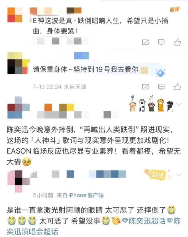 演唱会舞台又发生意外了。近日,港星陈奕迅世界巡演来到北京,但他在台上忘情演唱时,却不慎在倒退时踩空台阶,重重摔了一跤。虽然他立刻爬起来继续唱歌,但据现场观众表示,当时重物撞击声吓了一大跳。 ![]() 陈奕迅不慎在舞台上重摔,吓坏现场观众。(取材自微博) 当天,陈奕迅在北京华熙LIVE五棵松体育馆举办“FEAR and DREAMS”世界巡回演唱会,现场涌进大量热情歌迷。但在表演期间,陈奕迅后退时不慎踩空台阶,整个人重心不稳后仰重摔,据目击观众表示“摔下去的声音很大”,台下粉丝也一度惊呼。 不过,陈奕迅在摔倒后迅速爬起身,丝毫未中断演出,并用幽默化解紧张气氛,自称“屁股有肉,不会受伤”。当晚他照常演唱近两小时,安可曲目包括“淘汰”等。 粉丝惊吓之余,更敬佩陈奕迅的专业素养和敬业态度,有网友说,“他摔倒了还在唱歌,这就是为什么我们爱他”、“体现舞台即生命敬业精神”,也有不少歌迷在社交平台呼吁主办方加强舞台安全措施。 截至目前,陈奕迅团队尚未发布伤情公告,他的巡演行程也未有变动。 其实,陈奕迅近年多次传出健康问题与意外事故,去年6月因打网球中暑昏倒,导致下巴撕裂与腮骨骨裂,缝合30多针,导致重庆场演唱会延期;2025年5月又因确诊新冠取消高雄场,之后甚至爆出“过世”传闻,直到他出面澄清才终止谣言。 网友评论: ![]() 公开资料显示,陈奕迅出生于1974年7月27日。 今年5月15日,陈奕迅 Fear and Dreams 巡回演唱会官方微博发布延期公告: 歌手陈奕迅(Eason)突感身体不适,经医生诊断确诊为新冠肺炎,须立即停止所有演出活动并进行休养。原订5月16、17、18日于高雄巨蛋举行的三场演出将延期举行。 此后,其身体状况一直被歌迷担心记挂。 ![]() 来源:现代快报、三湘都市报、杭州日报 |