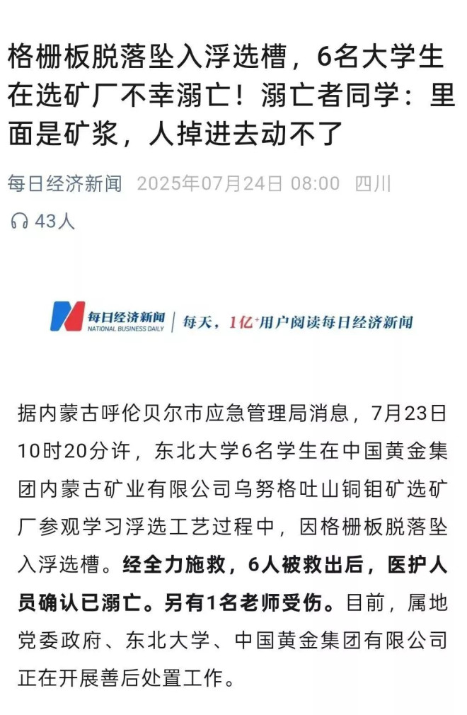 一大早刷到每日经济报道报道的《东北大学6名学生在内蒙古某矿厂参观学习中意外堕落溺亡》。 ![]() 整件事情是这样的: 这些学生是东北大学矿物加工工程专业的大三学生。7月23日上午10点20分左右,他们在老师带领下去中国黄金集团内蒙古矿业有限公司的一个铜钼矿选矿厂参观。就在他们学习浮选工艺时,脚下的金属格栅板突然脱落了,6个学生和1名老师一起掉进了下面的浮选槽里。 虽然救援人员47分钟后把他们救出来了,但6个学生都已经溺亡,只有老师受伤活了下来。 浮选槽是什么?简单说就是一个大容器,里面装满了矿浆。矿浆不是普通的水,它是磨碎的矿石、水和化学药剂的混合物,黏糊糊的像泥石流一样。 这是一个标准的矿厂浮选槽: ![]() ![]() 浮选槽一般五六米深,里面就像沼泽一样,全是粘稠矿浆,矿浆密度比水大得多常浓稠,有些浮选槽温度能到60℃,可能造成烫伤。 人掉进去后,就像被拽进沼泽里面一样,瞬间就没了。人坠入后,会被立刻浸没,而且会受到机械部件的毁灭者冲击,不可能自己爬出来。 这是矿浆近照。 简单地说,人掉下去,同时受到化学腐蚀+矿料摩擦+机械搅拌三重伤害。溺亡只是体面说法。 为什么会发生这种悲剧? 核心是格栅板脱落了。有学生说平时这里员工不多,但参观时学生老师比员工还多,7个人站上去可能超出了格栅板承受力。 ![]() 有工程师测算,按行业标准此类格栅板应能承受每平方米250公斤的重量,而6名学生分散站立时的总重量不超过500公斤,远未达到设计极限承重,这明确指向了长期腐蚀导致的结构失效。 所以按照常理来说,浮选槽上方一般不让普通人除了检修在上面走,尤其这么多人,当时参观的同学很多,在场也没人提醒下?检修也没有六个人站一块板的啊。 更讽刺的是,这家企业今年2月还发文章说换了浮选车间的格栅板,7月11日刚开了安全生产会议,结果还是出了事,多么可悲。 ![]() 局长查了一下,中国黄金集团党委书记、董事长,兼上市公司中金黄金董事长周洲,就是从东北大学毕业的。 此前有个学校叫黄金学院,后面被东北大学合并,全国搞贵金属好多都是黄金学院毕业的。 有人问为什么会有人选地矿专业? 因为就业有保障,本科毕业就有工作,去非洲好赚钱。 选这个专业的或者被调剂到这个专业的大部分都家里条件不太好,农村孩子非常多。他们也只是想早点出来赚钱给家里减负担而已。 加上这些学生父母大多45岁以上,孩子多是独生子女。培养一个考上东北大学的孩子多不容易啊。 这么一想更难受了。 |