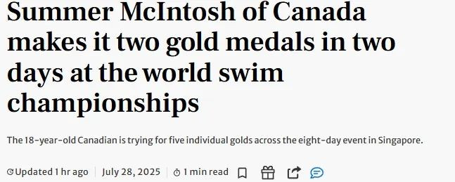新加坡游泳世锦赛的第二个比赛日成为加拿大与中国选手共同闪耀的舞台:18岁的加拿大天才少女萨默·麦金托什(Summer McIntosh)轻松摘下个人第二金,继续其创造历史的征程;年仅12岁的中国小将余姿迪(Yu Zidi)以第四名成绩震惊了泳坛,中国的覃海洋上演了带伤战胜奥运冠军的王者归来。 ![]() ![]() 图源:instagram@summermcintosh 两天。两枚金牌。 来自多伦多的18岁萨默·麦金托什(Summer McIntosh)在游泳世锦赛上取得了完美的开局,力争赢得五枚个人金牌。此前,只有美国传奇人物迈克尔·菲尔普斯(Michael Phelps)曾完成过此项壮举。 麦金托什在周一(7月28日)的女子200米个人混合泳比赛中,以2分06秒69的成绩夺冠。前一天周日,她在400米自由泳中赢得金牌。 ![]() 图源:instagram@summermcintosh 美国的亚历克斯·沃尔什(Alex Walsh)以2分08秒58获得银牌,铜牌则由加拿大的玛丽-索菲·哈维(Mary-Sophie Harvey)以2分09秒15摘得。 麦金托什的成绩与自己保持的2分05秒70的世界纪录尚有差距。 中国的12岁小将于子迪(Yu Zidi)以2分09秒21的成绩获得第四名,与奖牌擦肩而过,但她这一惊人的成绩震惊了泳坛。她还将参加400米个人混合泳和200米蝶泳的比赛,这可能是她最强的项目。 ![]() ![]() 图源:新华社 在接下来的比赛中,麦金托什将继续在400米个人混合泳、800米自由泳和200米蝶泳中追逐金牌。 ![]() 图源:instagram@summermcintosh 格雷琴·沃尔什(Gretchen Walsh)在周一取得了突破,为美国队赢得了在新加坡的首枚金牌,她在女子100米蝶泳中以54秒73的成绩夺冠。 作为一年前巴黎世锦赛的银牌得主,沃尔什此次的成绩与她今年早些时候创造的54秒60的世界纪录仅一步之遥。比利时的鲁斯·瓦诺特迪克(Roos Vanotterdijk)以55秒84获得银牌,澳大利亚的亚历山德里亚·珀金斯(Alexandria Perkins)以56秒33获得铜牌。 沃尔什在赛后池边的采访中承认,美国队遭遇了一场被队医称为“急性肠胃炎”的疾病侵袭。这是他们在抵达新加坡前,在泰国的一个训练营感染的。美国官员已确认了疫情,但未提供太多细节。 “这并不容易,我为自己感到非常骄傲,”沃尔什说,她对成绩能进入55秒以内感到非常激动。“这需要很大的勇气。我只是想上场为我的团队而战,很好地代表我们的旗帜。不知从何而来的力量,但我真的、真的很高兴。” 周一的赛程还结束了另外两项决赛。 2023年世锦赛冠军覃海洋(Qin Haiyang),在男子100米蛙泳决赛中击败了巴黎奥运会冠军、意大利的尼科洛·马丁嫩吉(Nicolo Martinenghi)。覃海洋游出了58秒23的成绩,为中国队赢得了在新加坡的首金,而这位意大利游泳选手以58秒58完赛。吉尔吉斯斯坦的丹尼斯·彼得拉绍夫(Denis Petrashov)以58秒88获得铜牌。 “我一直有伤在身,要恢复到最佳状态并不容易,”覃海洋说。“我最多只恢复了70%的状态。我可能比较幸运。这场胜利肯定有助于我的信心。” 在男子50米蝶泳决赛中,法国的马克西姆·格鲁塞(Maxime Grousset)险胜瑞士的诺埃·蓬蒂(Noe Ponti)。格鲁塞的成绩是22秒48,蓬蒂以22秒51完赛。意大利的托马斯·切孔(Thomas Ceccon)以22秒67获得铜牌。 |