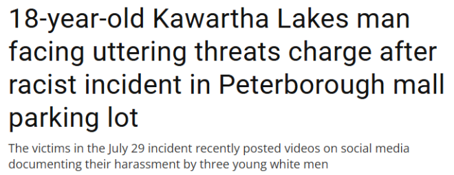 安省一名来自卡沃萨湖(Kawartha Lakes)的18岁男子,因在一次与种族主义相关的事件中发出威胁而被控罪。该事件发生在7月29日(星期二)彼得堡(Peterborough)Lansdowne Place购物中心的停车场。 ![]() ![]() 图源:kawarthanow 彼得堡警方在8月8日(星期五)收到有关该事件的报案后展开调查。 受害者是一对看起来是东南印度裔的男女,他们在8月6日将多段事发视频发布到社交媒体上,包括在“Peterborough Shares”脸书群组中。 “我和我的伴侣至今仍感到受到了创伤,我发帖是希望这种事不要再发生在别人身上,我们要求公正。”男受害者写道。 视频显示,这对情侣在停车场被三名年轻白人男子骚扰。当时这三人坐在一辆大型白色皮卡中,车子停在受害者车辆正前方的车位。 ![]() 图源:Reddit 视频中,其中一名男子下车,走到受害者车的驾驶座一侧,面对着正在用手机录像的男受害者,一边盯着他看,一边对着车辆的侧视镜做出“性动作”。 ![]() 图源:Reddit 视频中有一幕,男受害者走近皮卡,司机摇下车窗。当受害者问“你为什么这样靠近?”时,副驾驶的男子回答“因为你是黑人”,司机随即对副驾驶说“不是”。 ![]() 图源:Reddit 坐在后排的第三名男子(也是做出性动作的人)摇下车窗,对司机说“我不会说任何坏话”。 ![]() 图源:Reddit 当受害者试图与他交谈时,该男子说:“闭嘴,大鼻子”,并辩称对车做出性动作并不违法,还反问受害者“我碰你了吗?” “回答我的问题,你这个该死的移民。”他又重复了一遍侮辱,还两次称呼男受害者为“蠢黑鬼”(一次在对话中,一次是在受害者走回自己车上时)。 在另一段视频中,同一男子还可以被听到向男受害者发出死亡威胁。 视频发布后,有多名网友认出了白色皮卡中的三人身份。 警方调查包括观看这些视频。经过调查,并在与检察官办公室协商后,一名来自卡沃萨湖市的18岁男子被捕,并被控发出导致死亡或人身伤害的威胁罪。 被告已在具结条件下获释,并将于9月16日出庭。 彼得堡警方在新闻稿中表示,加拿大法律中没有专门的“仇恨犯罪”罪名可直接适用于此案,但“本案确实存在仇恨犯罪因素,这将在案件进入司法程序时得到处理。” 彼得堡警察局长斯图尔特·贝茨(Stuart Betts)在新闻稿中说:“任何看过这段视频的人都会明白,这种行为在我们社区、乃至任何社区,都是不可接受的。我感谢所有为此案提供信息的人。” “显然,这不是我们城市所能接受的行为标准。我们鼓励市民继续举报在社区中发生的仇恨偏见事件或犯罪。向警方举报这些事件至关重要,这能确保我们获取调查和在适当情况下提出指控所需的信息。我们致力于确保本地每一位居民、工作者或访客的安全。” |