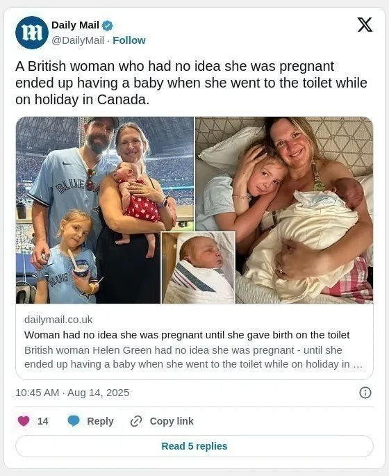 一名来自英国的女子在加拿大度假期间,意外在卫生间生下了一个女儿,才发现自己怀孕了。这一突如其来的“小惊喜”让她和丈夫都感到震惊,不过,他们的家庭更加完整,生活也因为小女儿的到来而充满了快乐。 ![]() 45岁的海伦(Helen Green)和她的丈夫迈克尔(Michael Green),以及六岁的女儿达西(Darcy),于5月21日抵达加拿大多伦多,开启了为期十天的公路旅行。海伦并不知道,她实际上已经怀孕九个月。 当天夜里,海伦突然醒来,感到肚子疼痛,便起身前往卫生间。她在坐下时感到一阵“推压感”,低头一看,竟然看到了一名婴儿。 ![]() 原来,海伦经历的是“隐匿性怀孕”(cryptic pregnancy),这种情况指的是怀孕者直到孕晚期甚至分娩时才发现自己怀孕。更为神奇的是,海伦依然有规律的月经周期,完全没有怀孕的症状。 “这一切对我来说简直是巨大的冲击,但同时也是一种非常美好的惊喜”。海伦回忆道,“她就这样突然出现,感觉她一直就在我们身边,生活变得完整了,她带给我们无尽的幸福”。 即使是医院的医生也对此感到震惊,“我完全没意识到自己怀孕,一切都很正常。我的工作、锻炼、穿衣和饮食习惯都没有变化”。 迈克尔也表示,“这真是太疯狂了,直到现在还感觉不太真实。真的是一段疯狂的时光,但初生女儿也带给我们无比的喜悦!” ![]() 海伦此前有过两次早产经历,并且在生下女儿达西后还经历过一系列流产,因此她一直认为自己正处于更年期。怀孕期间,她几乎没有任何症状,甚至在不知情的情况下每周依然去健身房锻炼。 ![]() 事发的当天晚上,家人们都已进入假期住宿的酒店休息,海伦在凌晨1点45分醒来,感到肚子疼痛,便走进了卫生间。她坐在马桶上时,突然感到有东西滑入马桶,低头一看,竟然是一名婴儿。海伦迅速将她从马桶里抱起,紧紧抱住。 “我完全不知道发生了什么,身体似乎自己在掌控一切。经过两次大力的用力后,孩子就出来了”。海伦说。 ![]() 爸爸迈克尔被婴儿的哭声惊醒,一开始还以为是隔壁房间的声音。等他走进卫生间,看到妻子抱着新生儿时,简直不敢相信自己的眼睛。随后,他立即拨打了911,救护车和消防队迅速赶到,将海伦和婴儿送往Mount Sinai医院进行检查。 迈克尔回忆道:“当时我处于一种完全迷糊的状态,完全不知道发生了什么。我们甚至都没有确认孩子是男孩还是女孩,直到一位急救人员告诉我们”。 在医院里,医护人员不断询问海伦怀孕的情况,而她只能茫然地回答:“我不知道”。 为了向亲朋好友报平安,这对夫妇向大家发送了信息,称“别担心,海伦在医院”,并附上一张达西抱着婴儿奥利维亚的照片。消息一出,大家都感到震惊但又欣喜不已。 ![]() 他们为女儿取名奥利维亚,这个名字来源于医院的一位护士。 虽然母女二人第二天就出院了,但由于奥利维亚没有任何出生文件,不能立即离开加拿大,夫妻俩不得不延长假期,等待奥利维亚的出生证明和护照。 海伦表示:“注册她的出生过程简直是一场噩梦。我们只有医院的出院单,而出生地是否为家中出生还是医院出生一度造成混乱。最后,我们不得不通过医生和急救人员提供签字声明来证明”。 ![]() 他们终于在6月25日顺利返回家乡,但这次意外的旅行额外花费了9000英镑,其中包括4000英镑的医院费用、2000多英镑的酒店住宿和1000多英镑的租车、机票、婴儿用品及生活费用。不过,他们希望大部分费用能通过旅行保险得到报销。 尽管如此,海伦一家还是享受了这段与奥利维亚共度的特殊时光。他们带着刚出生四天的奥利维亚登上了CN塔,观看了三场棒球比赛,还两次参观了尼亚加拉大瀑布。 ![]() ![]() 海伦总结道:“最终,我们得到了一个延长的假期,度过了一段非常特别的时光。虽然我们不知道还要待多久,平日里忙着追着出生证明和护照办理手续让人感到非常有压力,但周末一到,所有办公室都关门了,我们什么都做不了,反而轻松了很多”。 “有一个孩子不容易,但当你发现自己根本不知道自己怀孕时,那种感觉更是难以言喻。几天后,我开始习惯了有一个孩子在身边,真的非常开心”。 ![]() 只能说这个妈妈身体不是一般的强! |