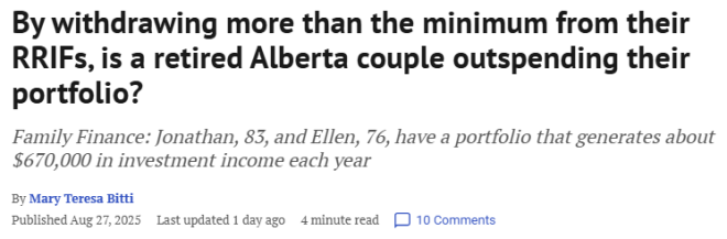 这不是凡尔赛,而是真实发生在加拿大的一对高龄夫妻身上。 富裕夫妻的“退休焦虑” 来自阿尔伯塔省的Jonathan(83岁)和Ellen(76岁)夫妻俩身体健康,预计能活到90多岁。他们坐拥有上百万资产,并建立了一个健康的、由专业人士管理的多元化投资组合,每年可带来约67万加元的“收入”,看上去早已实现了“退休自由”,但他们依然感到焦虑: “我们每年花20万生活,资产却越取越少,会不会等不到90岁,钱就先花光了?” ![]() 他们到底有多少钱? Jonathan的资产配置为60%债券、40%股票(包括另类投资)。Ellen则是55%股票、45%债券。 他们的投资组合包括: