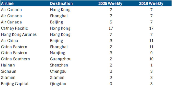 温哥华国际机场 (YVR) 有望在 2025 年创下客运量历史新高,部分原因是亚太地区旅游业的激增,包括中国大陆需求的稳步反弹。 ![]() 作为加拿大第二大机场,温哥华国际机场迎来有史以来最繁忙的夏季。 中国大陆和香港是全球最后几个取消疫情期间严格卫生限制的市场之一,重启过程需要对员工进行再培训,并重新启动停飞多年的飞机。 例如,香港旗舰航空公司国泰航空于 2024 年 6 月将其存放在澳大利亚沙漠设施中的最后一架停飞飞机重新投入使用,这是一个从 2022 年底开始的缓慢渐进的过程。国泰航空在 2025 年 1 月达到了恢复疫情前 100% 航班量的关键里程碑。 中国大陆的航空公司也遵循了类似的时间表重新扩展其业务,首先是国内业务,然后是国际业务。 疫情爆发前,中国大陆是温哥华国际机场 (YVR) 最大的客源地之一,主要通过直飞航班。温哥华国际机场飞往中国大陆的航班数量比北美任何其他机场都多。 目前,虽然中国大陆与温哥华国际机场之间的直飞航线数量和总座位容量仍低于疫情前的水平,但中国旅客的强劲需求正越来越多地通过亚洲各地的连接枢纽得到满足。 温哥华机场管理局航空服务发展总监 Russell Atkinson 本周在接受 Daily Hive Urbanized 采访时表示:“中国市场肯定与疫情之前有所不同,但今年我们已经开始看到一些良好的增长”。 更多直飞中国的航线 目前,来自中国大陆的新增需求中,很大一部分通过香港国际机场(HKG)转机。目前,香港国际机场每周有31个直飞温哥华国际机场(YVR)的往返航班。其中包括国泰航空每周17个航班(每日多班)、加拿大航空每周7个航班(每日一班)以及香港航空每周7个航班(每日一班)。 香港飞往温哥华国际机场 (YVR) 的运力现已完全恢复至疫情前的水平。香港航空于2025年1月恢复了温哥华国际机场的航线,每周两班,并于2025年5月扩展至每日一班,进一步推动了这一反弹。 疫情爆发前,温哥华国际机场共有八家航空公司运营到中国大陆的九条航线。2019年,中国大陆目的地与温哥华国际机场之间每周共有56个直飞往返航班,其中加拿大航空运营上海航线7个,加拿大航空运营北京航线7个,中国国际航空运营北京航线11个,中国东方航空运营上海航线11个,中国南方航空运营广州航线10个,海南航空运营深圳航线1个,四川航空运营成都航线3个,厦门航空运营厦门航线3个,首都航空运营青岛航线3个。 到 2025 年 9 月底,将有 8 家航空公司运营 9 条航线,每周共计有 28 个直飞往返航班,仅比 2019 年少一条航线,但航班数量是 50%。 中国南航将于 9 月 16 日重启广州航线,每周两班,直飞温哥华国际机场。中国东方航空将于 9 月 25 日重启上海航线,每周两班,中途不经停。 目前每周其他飞往中国大陆的航班包括:加拿大航空每周七班飞往上海,加拿大航空每周五班飞往北京,中国国航每周三班飞往北京,海南航空每周两班飞往深圳,四川航空每周两班飞往成都,厦门航空每周两班飞往厦门。中国国航北京航线自2025年8月27日起由每周两班增至每周三班。 “中国还没有恢复到疫情前的水平,但看到产能恢复令人欣慰。与此同时,看到地图上出现新的点,看到亚洲各地的增长,这确实是我们目前发展的重要组成部分”,阿特金森说。 ![]() 温哥华国际机场飞往中国大陆的目的地及航班频率对比。(温哥华机场管理局) 其他亚太地区新航线 除了经香港转机外,他还特别指出,许多中国大陆乘客也通过东京和首尔等枢纽抵达温哥华国际机场,这两个机场都提供频繁、高容量直飞温哥华的航班。 这表明中国大陆目的地与温哥华国际机场之间对更大直飞运力的潜在需求强劲,并表明存在巨大的潜在需求。 事实上,由于几家航空公司首次开通了飞往温哥华国际机场的航班,这两个日本和韩国的枢纽机场的运力近期都大幅提升,给这些航线带来了更大的竞争。 日本航空旗下的廉价航空公司Zipair于2024年3月开通了温哥华国际机场(YVR)和东京成田国际机场之间的航线,每周有三班。此后,该航线航班数量已增至每周五班,在繁忙月份则增至每周六班。 2025 年 7 月,廉价航空公司德威航空 T'Way Air 开通了温哥华国际机场 (YVR) 和首尔仁川国际机场 (ICN) 之间每周四次的航班服务。 阿特金森指出,Zipair 和德威航空早期取得了巨大的成功,其中德威航空接待了许多来自韩国的旅行团。 除了外国航空公司外,加拿大航空在温哥华国际机场的扩张还建立了与亚洲主要枢纽的新的直达航线,从战略上为东南亚、南亚、中东和澳大利亚的目的地提供了充足的连接。 加拿大航空新增了温哥华与新加坡和马尼拉的常年航线,并开通了飞往迪拜和曼谷的季节性航线。这些新增航线强化了加拿大航空将温哥华国际机场 (YVR) 打造为跨太平洋枢纽的战略,同时也进一步支持了机场管理局将自身定位为北美领先的跨太平洋门户的总体目标。 加拿大航空的曼谷至温哥华航线是泰国与北美之间唯一的直飞航线。阿特金森表示,正因如此,这条航线的业绩“异常出色”。 最新一趟加航是在2025年4月,当时加拿大航空开通了马尼拉航线——这是加拿大航空公司运营的唯一一条直飞菲律宾的航线。这条航线的开通得益于加拿大庞大的菲律宾社区的强劲需求,以及大量菲律宾亲友往返于两国之间。 他说:“这正是我们希望看到的,即东盟地区市场实现更大增长,我们看到那里人口结构强劲,贸易和旅游机