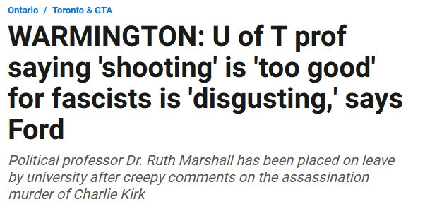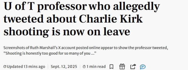 多伦多大学表示,因一条疑似针对本周美国右翼活动家查理·柯克(Charlie Kirk)被枪杀事件的推文,该校已将一名教授停职。 ![]() ![]() 图源:utoronto.com 根据网络上发布的截图显示,宗教学与政治学副教授鲁思·马歇尔(Ruth Marshall)在其现已设为私密的X账号中发文称:“坦白说,射杀你们这些法西斯还算轻的。” ![]() 图源:X 截图显示,这条推文发布于周三下午5:40,大约在美国总统唐纳德·特朗普社交媒体宣布柯克因颈部枪伤去世后约一小时。柯克当时正在犹他谷大学的一场活动中发言,东部时间下午2:20左右,被一名据信藏身于附近建筑屋顶的枪手射击。 多伦多大学媒体关系团队在周五给《星报》的邮件声明中说:“大学在得知该教授发布令人担忧的社交媒体内容后,立即采取了行动。” 声明还称,“此事正在调查中,大学不会进一步发表评论。”并指出马歇尔已不在校园内。 多伦多大学政治学系和宗教学系网站上,马歇尔教师的页面已无法加载,显示“访问被拒绝”。 马歇尔没有立即回应置评请求,但据《国家邮报》报道,她周四曾在推特上表示,她的言论并非针对柯克被枪杀事件,而是“指的是该人的卑劣和可憎品格,而非杀人的行为”。 ![]() 图源:reddit 这条推文引发了多伦多大学内部及全省的强烈反响。 多伦多大学理事会成员、放射科医生大卫·雅各布斯博士(Dr. David Jacobs)在X上写道:“煽动针对不同意见者的暴力言论,是文明讨论的对立面。这种煽动既不受言论自由保护,也不属于学术自由。” 福特怒斥!安省省长福特(Doug Ford)表示,多伦多大学一名教授称“射杀”不同意见者“还不够”的言论令人“恶心”。 “这太恶心了,”福特周四对《多伦多太阳报》说,“真是病态。” ![]() ![]() 图源:X/@wtfis2bdone/TorontoSun 这位教授并非唯一在这起令人发指的谋杀案后发表令人不安评论的人,加拿大政界和媒体界有许多类似的怪异回应。 但这位在多大圣乔治校区任教宗教学和政治学的副教授的言论,引发了极大的震惊和厌恶。 The Pleb Reporter发帖称:“多伦多大学政治学教授谈查理·柯克去世:‘如果你想知道为什么现在大学里的年轻人越来越激进,’这些就是那些洗脑学生的卑劣教师。” 《太阳报》评论员Joe Warmington指出,此事也反映出为何许多保守派人士害怕表达自己的观点——不仅仅是担心会被射杀甚至更严重的事(正如该教授的推文所示),更是担心因此失去地位、成绩或未来。 Warmington说,没有人应该因政治观点或立场而被恐吓或威胁,这正是自由和民主的核心所在。 他反问道:当大学教授竟然炫耀说“射杀”某人“还不够”时,你还会觉得把孩子送去多伦多大学安全吗?那里对持保守思想的学生安全吗? 安省高校厅长诺兰·奎因(Nolan Quinn)重申了省长的观点,他在X上发帖说:“大学及其教授应当培养批判性思考、尊重的辩论,营造安全的学习环境——而这位教授的暴力言论公然违背了这一点。”他已明确告诉多伦多大学,校方需要“采取行动”。 |