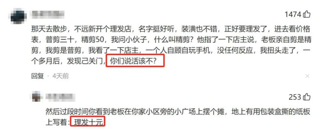 没有人能笑着从理发店走出来! 这句话真不是玩笑,如今“谈卡色变”正成为中高端理发店的痛点,再没有人来充值,那地段好、租金高、人工成本高的理发店,真的很难坚持下去了。 天价理发店横行 给自己“镶金”的理发师 中高端理发店的咖位有一条“鄙视链”: 从普剪、精剪、店长、首席造型到总监价格不封顶,你选择的价位就注定了接下来你在理发店的地位以及待遇。 有网友表示: 那天去散步,不远新开个理发店,名字挺好听,装潢也不错,正好要理发了,进去看价格表,普剪30元,精剪50元,我问小伙子,什么叫精剪? 他指了一下店主说,老板亲自剪是精剪,我剪是普剪,我看了一下店主,一个人自顾自玩手机,没任何反应,我扭头走了,一个多月后,发现己关门,你们说活该不? 现在的理发店也有一条“鄙视链”,光是店面的装修风格就分多种,有些装修的很“欧式”,有些装修的很“日式”,有些装修的很“会所派”,有些则装修的很像“工作室”,价格差距非常大。 ![]() 市场会让每一个“嘴比剪刀硬”的Tony老师闭嘴。 ![]() 理发师之间的鄙视链是经验以及出师是否有名,有的是学徒,有的是在知名理发学院毕业,有的在国外留学进修。 还有的是为一些明星弄过造型,参加过一些时装周等,都可以拿来当抬高自身价格的背书。 ![]() 市场很多平价理发店的存在,被所谓“进修”过的Tony老师瞧不起,更有傲慢者说他们搞坏理发行业,刻意压价、恶意竞争。 但理发这一行业,平头老百姓一直以来能接受的价位,就是从以前的5元、10元到现在的30元、40元。 理发店没花心思在剪发上 变着法推销项目、办卡 ![]() 现在除了一些老街,80后已经很难找到小时候那种门前有旋彩的灯,透明的拉窗,玻璃上明码标价不宰客的理发店了。 还有更老式店里很传统的沙发,还有皮质座椅可以架脚,甚至还会老式刮胡须的师傅。 ![]() 现在的师傅变为“Tony老师”,他们重点不是帮你理发,而是想让你充值,为了他们的业绩,可谓是使出浑身解数,使理发这一行业大变质,理发师变成销售了。 你本来只是想剪个刘海,以为花30元已经很可以了,没想到最后在Tony老师的三言两语之下,你顶着个花里胡哨的大花头出去,从30元变成300元甚至更多。 很多理发店见到上了年纪的男顾客心里是抵触的,因为想“忽悠”他们充值办卡很难,只能是每个月只赚他们几十元的洗剪吹,就已经很好了。 ![]() 现在一些80后、90后甚至是00后,其实也有自己的省钱妙招,他们会自己在网上买一些植物染、染头膏等,自己在家DIY头发,或者朋友之间互相“搓发”。 和理发店形成鲜明对比的是假发店,假发店的生意出奇好,毫不夸张买一顶假发花的钱,都比去理发店花的钱少。 ![]() 不管是男士还是女士,有掩盖秃顶、前置刘海、假马尾、大波浪等,只要你心中有发型雏形,一般假发店都能给你想要的,效果不比Tony老师差。 理发店越来越少,留到最后的一定是真手艺人,但门店越来越少,剪头发的费用也越来越贵,这还不排除中间给你推销的“套餐”。 普通店员剪个头发,88元都算良心价了,要是店长出手,那要在前面加个1,毕竟百元起的价钱才能衬托起店长的“金剪刀”。 而且很多理发店真的很会看人下菜碟,你要纯粹剪头发,那你这个半小时感受到的是吹风机的“凉风”,你要是听他们的劝,办个卡或者消费其他的,什么按摩、洗脸、姜疗等,那迎接你的全程都是“善意”。 顾客的钱也不是随意给的,有没有实力顾客说了算。 一年高达30万家 知名美容美发店接连倒闭 ![]() 很多表面装修豪华,但里面的理发师,手上真的没有两把刷子,这些店面营业没几年就关门大吉。 因此,理发店一个接一个倒闭,而且还出现了不良理发店,在闭店跑路前还坑蒙顾客充值,没有把顾客的充值卡储蓄金还给顾客。 ![]() 很多消费者只有等头发长了才会去剪发,没想到第二次去剪发的时候,理发店已经关上了大门,人去楼空! 2022年到2023年期间,就已经有多家知名美容美发店倒闭,如“上海银色·美之家”、永琪美容美发、东田造型、上海蒂凡尼美容美发,有的转让,有的破产... ![]() 而对于在这些倒闭的美容店中还有大额充值的中产顾客来说,钱都打水漂了。 理发店也有“宰客”现象 中产已经不买单了 ![]() 上世纪90年代到千禧年初的理发店还没流行办卡制,大家去剪发真的很纯粹。 这些老式理发师一天的流水额也有限,毕竟按一人半小时计算,一天下来能服务20位顾客已经算是很好的生意了,一天流水有千元就已经很不错了。 80后、90后常光顾老式理发店的业务应该是拉直项目以及染发。 ![]() 做一下头发拉直,价格从100元到200元不等,很少超过200元,染发则更便宜,几十元就可以染的很好了。 现在的高端理发店,拉直比较少了,烫卷业务反倒更多,有烫就有染,价格对比20多年,后面要多加个0 。 ![]() 大胆选一家装修富丽堂皇的高端理发店,做个烫染项目,兜里没有2000元可走不出来,不是真中产还真不敢进。 因为你不知道原来植发是论根不是论一头,不知道给你剪头发的是总监还是首席。 ![]() 图源:正观黄河评论 2025年3月,云南昆明某个美发店就出现了“欺客”事件,有顾客到了店里选了个1480元的项目,结账时却变成了7680元。 离谱的是,这笔钱她还只能吃哑巴亏先付款,不然她连客诉的机会都没有。 因为有了会员制,还有其他的美容、美发、SPA等业务,一天万元的流水都算小的了。 价格