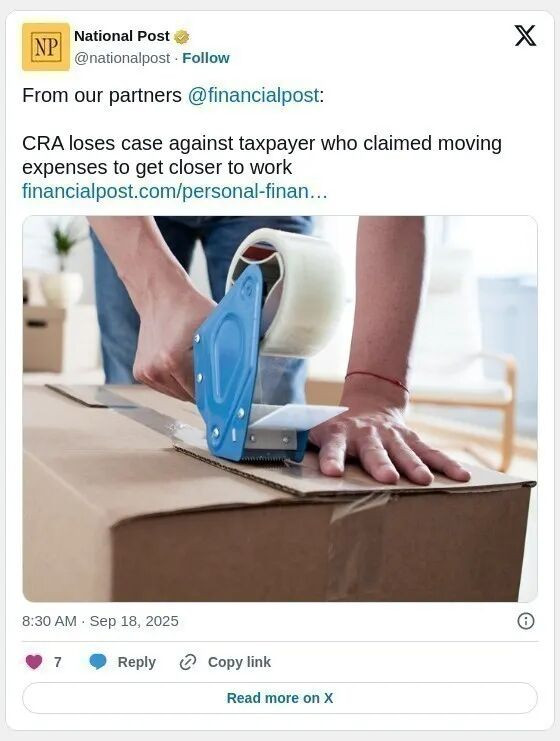 搬家本就开销巨大,但在加拿大,若因工作、经商或就读全日制课程而搬迁,符合《所得税法》相关规定者,可在个人报税时申请搬家费用抵扣,以减轻经济负担。不过,这项抵税优惠有严格限制,稍有不慎便可能遭遇加拿大税务局(CRA)的质疑与否决。 ![]() 一宗近期在加拿大税务法庭(Tax Court)审理的案例,就揭示了在“搬家距离”这一关键判断标准上的争议——到底什么是合格的搬迁距离?如何正确计算?这场涉及近13万加元搬家费用的上诉案,为我们提供了最新解读。 搬家抵税的基本条件 根据《加拿大所得税法》,若因以下原因搬迁,即有可能申请抵扣相关费用: