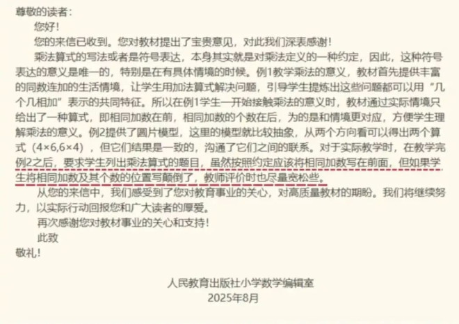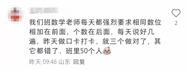最近,一道小学二年级的数学题在网上引发关注—— 有3个盘子,每盘8个水果,一共有多少个水果?列式是3×8还是8×3? 有学生写列式为3×8,却被老师判错。 老师解释,写乘法算式,应先找每份数写在前面,再找有几份写在后面。 应列式为:每份数x份数=总数(相同的加数x相同加数的个数=总数) ![]() 但这让一些辅导作业的家长直呼不明白:明明结果是一样的,顺序有这么重要吗?明明从小自己学的时候,只要结果是对的,就能判对! ![]() 01 前几天,浙江杭州萧山一位家长留言表示遇到了同样的问题。他的孩子在加法算式改写乘法算式的题目中,写的答案是: “7+7+7=3×7”“8+8+8+8=4×8”“9+9+9+9+9=5×9”…… 这位家长去请教了数学老师,老师表示二年级按新教材批改,这些写法都是错误的。 ![]() 有老师解释,2025年秋季学期开始,老师要求学生清晰掌握乘法算理,明确列式写法为“每份数×份数=总数”,即3个2相加的乘法列式为2×3,2个3相加的乘法列式为3×2,用这种方式帮助学生建立“量×份数”的认知结构,了解倍数关系。 一些小学数学老师表示,现在和二年级的小朋友说每份数×份数=总数,他们可能还不会理解,他们主张跟孩子这样介绍:相同加数×个数=总数。 杭州拱墅区一所小学教二年级的包老师称,原来在乘法列式时对顺序要求并不严格,今年教材要求更为明确。这样的规定要求老师在上课时要更深入、详细地解释乘法的含义,“我个人认为是有必要的,孩子们会更明白乘法是什么,而且对后面学除法也有帮助。” ![]() 有数学老师在人民教育出版社的教材反馈平台上问了这个问题。 出版社回复称:乘法算式的写法或者是符号表达,本身就是对乘法定义的一种约定,因此,这种符号表达的意义是唯一的,特别是在有具体情境的时候。 ![]() 02 乘法算式要不要计较顺序,网友们意见不一。有网友反馈孩子纠正起来很困难。 ![]() 不少网友支持,认为乘法的逻辑要明确。“3只5两的梭子蟹和5只3两的梭子蟹,虽然总重量相等,但两者区别很大。” ![]() ![]() 也有网友支招:“把单位写上去一眼就看明白了。” ![]() 对此,你怎么看? |