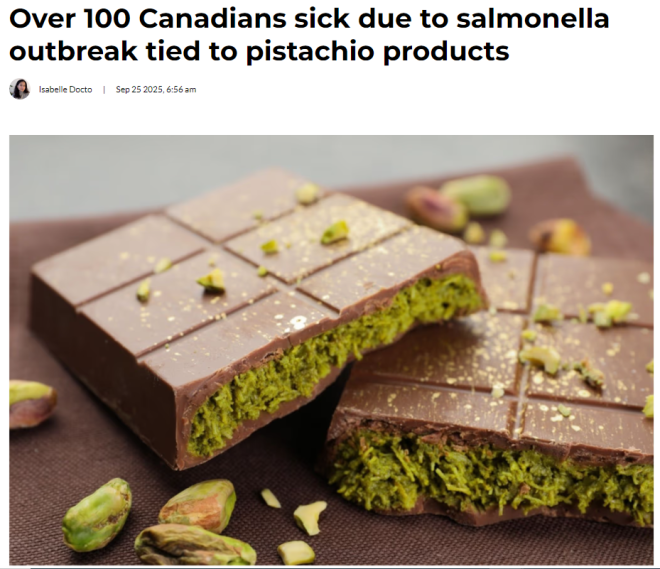 加拿大爆发开心果相关沙门氏菌疫情 超过百人感染! 如果你喜欢吃带开心果夹心的迪拜风味巧克力棒,最近可能要格外留意。加拿大公共卫生局(PHAC)近日更新通报称,一场与开心果产品相关的沙门氏菌疫情正在加拿大持续蔓延,目前已确认 105 例感染病例,涉及六个省份。 ![]() 哪些省份受影响? 根据 PHAC 公布的数据,感染病例分布如下: 魁北克:66 例 安大略省:27 例 卑诗省:6 例 阿尔伯塔省:4 例 曼尼托巴省:1 例 新不伦瑞克省:1 例 ![]() ![]() 患者的年龄范围从 2 岁到 95 岁不等,其中至少 16 人住院,但目前尚无死亡报告。卫生部门提醒,由于确诊需要一定时间,真实感染人数可能远远高于官方数字。 疫情源头在哪里? 官方调查显示,许多感染者在发病前曾食用过开心果或含开心果的食品,其中包括迪拜风味巧克力和一些糕点产品。实验室检测结果证实,在部分被召回的开心果及巧克力中发现了与患者相同的沙门氏菌菌株。 ![]() 早在 8 月初,加拿大食品检验局(CFIA)就已经针对 Habibi、Al Mokhtar Food Centre 和 Dubai 等品牌的开心果产品发布过召回警告。此后,受影响的品牌和产品清单不断增加,目前涉及的范围已相当广泛。完整召回名单可在 CFIA 官网查询。 沙门氏菌感染有哪些症状? 感染沙门氏菌后,通常会在 6 到 72 小时内出现症状,包括: 发烧、寒战 恶心、呕吐 腹泻、腹痛 突然头痛 大多数人能在一周内自行康复,但对于 儿童、孕妇、老人及免疫力较弱的人群,感染可能引发更严重的并发症,需要住院治疗。更需要注意的是,即使症状消失,感染者仍可能在几天甚至几周内继续传播细菌。 ![]() 官方防护建议 PHAC 提醒大家: 检查家中是否有被召回的产品(注意品牌、规格、UPC 和批次号) 不要食用、出售或分发召回产品,也不要用它们做菜 将产品退回购买地点,如有疑问请联系零售商 如果已经出现症状,应及时联系家庭医生或医疗机构 感染者不要为他人准备食物 事实上,这并不是加拿大第一次因食品引发沙门氏菌疫情。就在几个月前,国内还经历过一起与萨拉米香肠产品相关的长时间疫情,直到大规模召回后才逐渐平息。卫生专家也指出,食品链条的全球化和进口量增加,让这类跨区域爆发的可能性更高。 ![]() 目前,加拿大公共卫生部门和 CFIA 仍在持续追踪调查,预计后续可能还会公布新的召回产品名单。 这次开心果相关的沙门氏菌疫情,已经让超过百名加拿大人中招。虽然大多数人会自行康复,但对高风险人群来说仍可能造成严重健康威胁。大家近期如果买过开心果类零食或巧克力,一定要上 CFIA 官网确认有没有被召回,有疑虑的产品宁可退掉,也不要冒险食用。 新闻信息来源:https://dailyhive.com/vancouver/salmonella-pistachio-outbreak-sick |