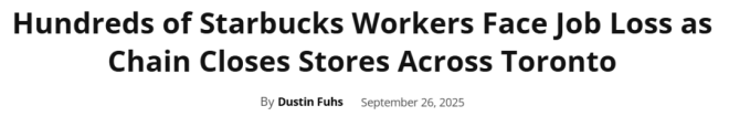 星巴克本周宣布,将在9月底前关闭北美约400至500家门店,作为其10亿元重组计划的一部分。在多伦多,已确认将关闭13家门店,这意味着数百名员工将失业。 相比往年的正常关店规模,此次行动更为激烈。首席执行官Brian Niccol承认,这是“一项更为重大的行动,我们理解这将对员工和顾客产生影响”,此举也是公司艰难推进的“重返星巴克”转型战略的一部分。   图源:Dustin Fuhs 多伦多在2021年已经失去了29家门店 多伦多关闭13家门店或许规模不大。但别忘了,在2021年初,星巴克曾在短短几天内关闭29家多伦多门店,当时彻底改写了这座城市的咖啡地图。 那一波关闭波及了包括Scotia Plaza、First Canadian Place、PATH多家店铺,以及Yonge Street上的关键门店(如College、Wellesley)。 加拿大本周宣布的关闭,星巴克在短短4年内已关闭超过40家多伦多门店——这是星巴克从加拿大最大城市大规模撤退的一次。  图源:Dustin Fuhs 即将关闭的13家多伦多门店 - 1 Yorkville, 1 Yorkville Ave, Toronto, ON M4W0B1