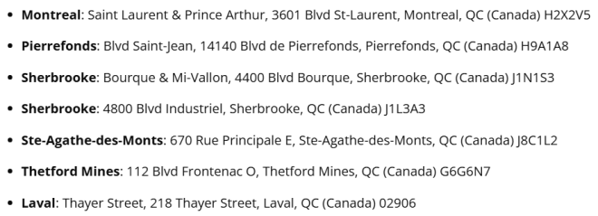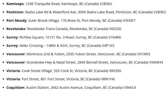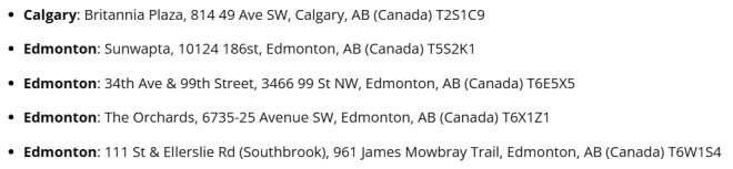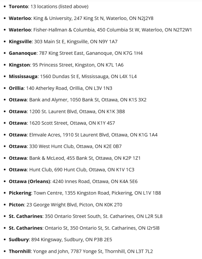 - 渥太华:Bank & Alymer、St. Laurent Blvd、Scott Street、Elmvale Acres、West Hunt Club、Bank & McLeod、Hunt Club、Orleans Innes Rd共7家