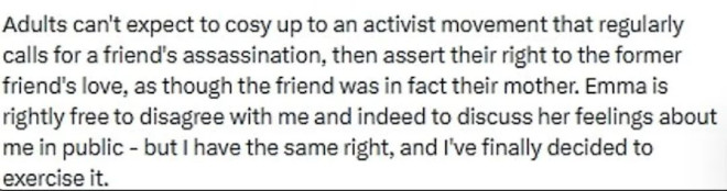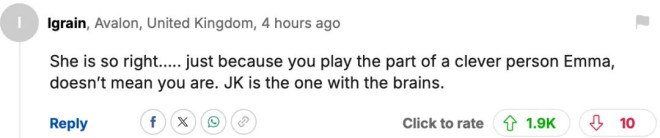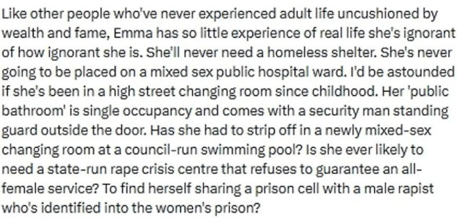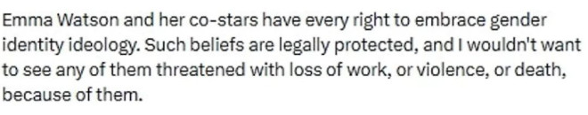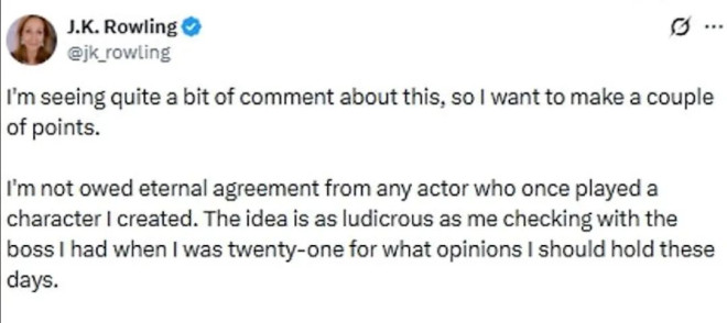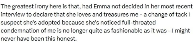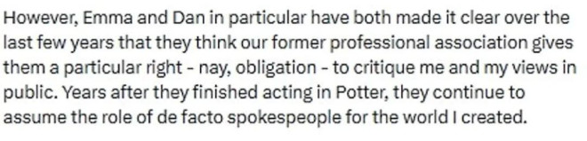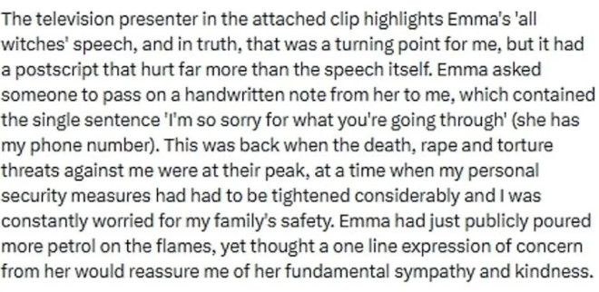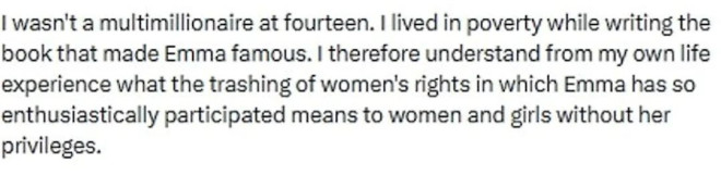 话说,罗琳和《哈利波特》主演三人的跨性别议题大战已经进行了多年,这些年来,双方态度都很强硬,从未因为私交而在这个话题上让步。 在这场唇枪舌战中,罗琳作为支持女性权益优先于跨性别权益的为数不多的公众人物,一直以来都背负着巨大的压力甚至安全威胁。 但罗琳一直很刚,从来没有因此噤声,反而越来越积极发言和分享她观点背后的深意。 就在这几天,双方大战又再突然爆发。这次,当年那个饰演聪明勤奋学霸“赫敏”的艾玛沃特森,遭到了罗琳的攻击。 罗琳一直笔力就很强,这次她的怒怼,简直把艾玛这个渗入影迷和粉丝心中的“女学霸”的人设完全推翻了。罗琳直接评价她“无知”,让人深感意外… 先来看看罗琳的发言。 当时,她在社媒上发推,说最近很多人在问她关于艾玛的事,所以她索性就一次性讲清楚了。 ![]() 她首先划清了和艾玛的思想界限: “我并不欠任何曾经扮演过我创作角色的演员的永久认同。这种想法就像我21岁时向老板确认我现在应该持有什么观点一样荒谬。” 话锋一转,她又表达了不希望三主演因为她被网暴和影响生活: “艾玛·沃特森和主演们完全有权接受性别认同意识形态。这些信仰受到法律保护,我不希望看到他们中的任何一个人因此而受到失业、暴力或死亡的威胁。” ![]() ![]() 但另一方面,她不会忍受三人的胡作非为: “艾玛和丹尼尔(哈利波特扮演者)在过去几年里都明确表示,他们认为我们之前的职业协会赋予了他们特殊的权利——不,是义务——在公开场合批评我和我的观点。在他们结束《哈利·波特》的演出多年后,他们仍然扮演着我所创造的世界的代言人角色。” ![]() 接着罗琳说出了自己对三人的态度发生彻底转变的过程: “当你从十岁起就认识一个人时,很难摆脱某种保护欲。直到最近,我才终于摆脱了那些在恐怖的大片场里,这些需要有人温柔地哄着才能把台词说出口的孩子们的记忆。” 罗琳重点讲述了一件艾玛做的让她非常愤怒和失望的事情: “过去几年里,我多次拒绝记者就艾玛发表评论的邀请,尤其是关于JK·罗琳的‘女巫审判’的邀请。 讽刺的是,我告诉制片人,我不想因为我说的任何话而让她受到网暴和追捕。 一位电视主持人重点提到了艾玛那句‘全是女巫’的演讲,说实话,那段演讲对我来说是一个转折点,但它后面发生的事情比演讲本身更伤人。 艾玛托人把她亲手写的便条转交给我,上面只有一句话:‘我对你所经历的一切深感抱歉’(她有我的电话号码)。 当时,针对我的死亡、强奸和酷刑威胁正达到顶峰,我的人身安全也不得不大幅加强,我时刻担心着家人的安全。 艾玛刚刚公开火上浇油,却以为她一句关心就能让我感受到她发自内心的同情和善意。” ![]() 说完这个铺垫,罗琳直接拿出大炮狂轰艾玛: “就像其他从未经历过没有财富和名望的成年生活的人一样,艾玛对现实生活如此缺乏经验,以至于她对自己的无知一无所知。 她永远不需要进无家可归者收容所。她永远不会被安排到男女混合的公立医院病房。如果她从小就住在商业街的更衣室里,那我才震惊。她使用的‘公共浴室’是单人间,门外还有保安站岗。她真的需要在市议会运营的游泳池新设的男女混合更衣室里脱衣服吗?她真的需要去一个拒绝保证全女性服务的性侵危机中心吗?她会有自己和一个被关进女子监狱的男性强奸犯同住一间牢房的经历吗?” ![]() 罗琳进一步讽刺艾玛脱离现实,对女性犯下弥天大错: “她十四岁就是千万富翁了。而我在写那本让艾玛成名的书时,生活贫困。 因此,我从自己的人生经历中深刻理解,艾玛如此积极地参与到践踏妇女权利的活动中,对那些没有她那样特权的女性和女孩意味着什么。” ![]() 炮轰完艾玛的无知和特权后,罗琳接着怒怼她的行径: “最大的讽刺在于,如果艾玛没有在最近的采访中宣布她爱我、珍惜我——我怀疑她之所以改变策略,是因为她注意到,对我的大声谴责已经不像以前那么时髦了——我可能永远不会如此坦诚。” ![]() 最后,罗琳表示自己和艾玛已经不再是朋友,而她也决定不会再隐忍不发: “成年人不可能指望与一个经常呼吁暗杀这位朋友的激进运动沾边,然后又宣称自己有权获得这位前朋友的爱,仿佛这位朋友就是他们的母亲。 艾玛完全可以自由地反对我的观点,甚至可以在公开场合谈论她对我的感受——但我也有同样的权利,而且我最终决定行使这项权利。” ![]() 罗琳的千字发言,应该能让艾玛彻夜难眠了。 发布如此公开和“恶毒”的评论,罗琳两次透露背后的导火索,一次是2022年的英国电影学院奖颁奖典礼上的演讲,艾玛表明自己“为所有女巫而来”,暗讽罗琳,给罗琳和家人的人身安全带来巨大威胁,事后轻飘飘的一张抱歉便条,就想把自己摘干净。 ![]() 而第二次,也是最近的一次艾玛惹怒罗琳,却是最近一次艾玛对罗琳的“深情表白”。 今年35岁的艾玛,在做客一个播客节目时,和年轻的男主持交心谈论了这几年间私底下她和罗琳的关系。 ![]() 她表示自己多次试图和罗琳展开一场对话,她试图电话她、短信她、写信她,通过共同朋友联系她,甚至直接表示自己可以打飞的飞到爱丁堡和罗琳当面谈谈,但罗琳无一例外都拒绝了,或者忽视了她的请求。 主持人也在旁边感叹说没想到艾玛做了这么多试图展开沟通的努力,对艾玛表示了赞叹。 也是在这场