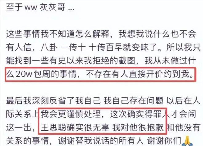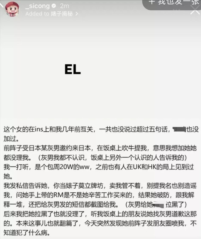 继王健林被限高又取消后,王思聪最近也搞出了大动静。 他深夜在ins上突然开火,指名道姓地说某个女网红是“包周20W的外围女”,一点情面都没留。 他还把女网红的账号主页直接晒了出来,正脸完全露了出来,配文毫不客气:“当X莫立牌坊”。 这一通操作下来,差点把人家饭碗都给砸了。 ![]() 王思聪自述和这个女网红几年前在ins上互相关注了,但几年来两人说的话不超过五句,根本算不上认识。 谁知道这个女网红为了抬高自己身价,在日本的一个饭局上跟人吹牛,说王思聪曾经追过她,她都没搭理。 她这么吹牛可能觉得话传不到王思聪耳朵里,可偏偏饭桌上坐着王思聪的朋友,转头就把这事告诉了他。 ![]() 王思聪一听就火了,觉得自己被一个外围女造谣抹黑,立马通过私信联系到女网红,一顿输出。 女网红被戳穿后立马怂了,连连道歉,还把自己跟“灰男”的聊天截图发给了王思聪,解释说自己是正经想谈恋爱,不想谈钱搞一次性的。 没想到这解释反而让王思聪更火大,觉得她不仅污蔑自己名声,还“又当又立”,之后灰男和王思聪都把她拉黑了。 ![]() ![]() 事情到这儿本来已经翻篇了,结果王思聪最近发现这个女网红居然在朋友圈骂他,这下可把他彻底惹恼了,干脆直接在网上曝光了她。 女网红一看情况不妙,又赶紧发动态道歉,否认饭局上的事,说一切都是误会,是有人在造谣。 不过这篇道歉文发出来没多久就又删掉了,也不知道是反悔了还是怕再被锤。 ![]() 说真的,王思聪虽然感情生活一直挺丰富,但他找的基本都是正经女网红,算是正儿八经谈恋爱。 他对外围女这种游走在法律边缘的人群,还是挺瞧不上的,所以被这种人拿来做文章,他肯定忍不了。 有网友说得挺直接:“王思聪这是得不到就要毁掉吧?” 也有人翻旧账,说王思聪是“造黄谣惯犯”,之前造谣过鞠婧祎,骂朱圣祎被告胜诉后还拒不道歉。 不过这次看来,王思聪是真的觉得自己被惹毛了,才选择公开爆料,所以才特意写了小作文解释前因后果,强调自己不会随意骂人。 ![]() 说起来,王思聪最近的心情可能确实不太好。 他名下的上海熊猫互娱文化有限公司最近被执行1210万。 他爹王健林也刚被限制高消费,虽然后来撤销了,但大连万达集团现在还有一大堆麻烦事。 经济问题缠身,再加之被该网红造谣,王思聪即便有两位美女相伴吃饭,看起来也一点不开心,全程玩手机。 ![]() 前几天在新加坡机场过安检时,王思聪就被拍到顶着一头红发,但因为机器高度问题,不得不半蹲着身子扫脸,看起来特别狼狈。 他虽然是一个人到新加坡的,但最近被拍到去大排档吃饭时,身边却有两位妙龄女子作陪,看样貌和身段,是他喜欢的类型。 只能说,瘦死的骆驼比马大,王思聪还是王思聪。 即便孤身去往新加坡,即便想吃大排档,但身边依然少不了美女。 ![]() 说到女伴,王思聪和懒懒已经相恋一年多了,尽管屡次被传分手,尤其王思聪前段时间在澳门时还被拍到与一女子同行。 但懒懒也发过两人的亲吻照辟谣分手,两人前几天还一起在大阪玩了一圈,感情很是稳定。 只不过,王思聪这样的不婚主义浪子,懒懒终究不能总把他拴在身边,人家一不开心就去玩了,而且还是两个美女。 懒懒终究会是过客,趁机多赚钱才是王道。 ![]() 怒撕网红事件,不少网友觉得王思聪是在故意制造花边新闻,帮家族转移注意力。 不过看来王思聪根本不在乎别人怎么说。 他照样在网上吵架,照样被偶遇与美女约会,只是身形看起来瘦削了一些,那可能只是他生活中的一个小插曲。 但话说回来,那个女网红也确实挺倒霉的。 在王家这个节骨眼上招惹王思聪,正好撞枪口上了。 这次撕网红事件暂时就到这里,还没后续。 但以王思聪的性子,谁知道接下来还会爆出什么更劲爆的呢? 咱们就拭目以待吧。 |