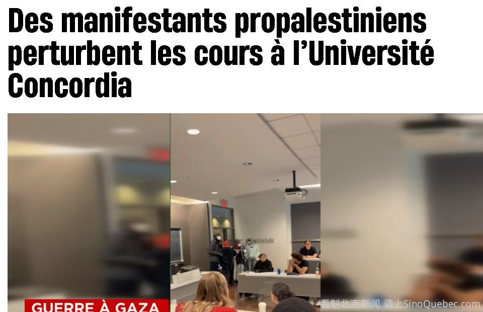 本周一和周二,蒙特利尔超过45,000名学生将参与罢课,以声援巴勒斯坦。在这次行动周中,他们的任务之一是扰乱课程,今天周一上午在康考迪亚大学(Université Concordia)就发生了这样的情况。 一些戴口罩或蒙面、佩戴黑白格纹kufiya围巾的示威者,在康考迪亚大学的走廊内大声示威,甚至闯入了一堂政治学课程。 在一段视频中,可以看到一条大横幅写着:“没有撤资,就没有和平”。 有学生对示威者喊道:“Get out of the class!(离开我们的课堂!)” 此次学生行动响应了“为巴勒斯坦撤资”(D4P)和“反资本主义斗争联合会”(CLAC)的号召。 此次罢课采取的是守门式行动,即学生站在教室门口,阻止教师进入课堂。
