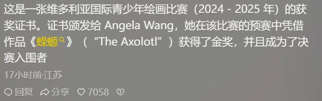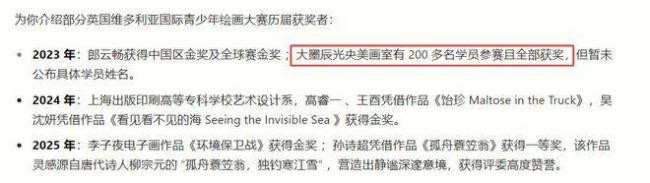 李湘又来报喜了!10月9日,李湘发文恭喜女儿王诗龄拿下金奖,还甩出了一张获奖证书。不过一连串英文大家真是看不懂,大家比较好奇的是王诗龄拿的这个金奖含金量有多少。 也别怪网友多疑,实在是星二代们扎堆都往艺术圈跑。今年7月份,刘芸携14岁儿子赴日本东京参加画展,还拿到了奖。 就在大家感慨刘芸闷声干大事时,才发现这个奖项,黄圣依的小儿子居然也拿过。之后网友扒出这个所谓的画展,其实是花钱就能参加的,压根没什么含金量。 艺术这个东西,本就没有标准答案,神作和涂鸦 ,往往都是一步之遥。 那么问题来了,她拿的这个奖项含金量如何呢? 据悉,王诗龄拿的是英国维多利亚国际青少年绘画大赛的金奖,该比赛是专门为 6到18岁青少年设立的全球性绘画比赛平台,主办方是伦敦国际青年艺术家协会 ,接受的作品形式也十分多样,从,如油画、色粉画、水粉画、水彩画、素描、木刻、雕塑等,而且需报名费用。 国际初赛费用是 180 元人民币 ,总决赛费用是 480 元人民币,国际总展览费用是 1800 元人民币。 再看下历届获奖者也 有不少中国人,其中2023年大墨辰光央美画室有 200 多名学员参赛且全部获奖。在网上可以轻松搜到很多人晒出拿奖证书,还有机构表示可以帮助学员拿奖,获得国际留学的背景提升。 ![]() ![]() ![]() ![]() ![]() ![]() ![]() 这么看来,这个奖项的含金量实在不算高。 大家都知道王诗龄 的爷爷的著名画家王晖,王诗龄本人也在英国读艺术系,而且从小被营造出画技不凡。9 岁时画作《孔雀》拍卖成交价达 12 万元,2024 年作品《桃子》以百万元高价成交,刷新青少年画作拍卖纪录。 ![]() ![]() 不过很难说王诗龄画作在市场上这么受欢迎,和家庭背景无关。 当然换个角度想,艺术这个东西本就没有标准答案,比拼的或许就是人脉资源。有人愿意买单,那就是赢家了。 王诗龄拿的“金奖”被扒后,网友纷纷感慨太水了。不过也有网友发现了王诗龄的拿奖作品,认为王诗龄也是有真才实学的,拿奖可谓当之无愧。 ![]() 李湘晒出的一组照片中,有一张是晚宴照,最初大家以为这是一张照片,仔细看才发现这或许是王诗龄拿奖的画作。若是如此,很多人惊叹王诗龄的画艺已经到了以假乱真的地步,拿奖可谓当之无愧。 ![]() ![]() 虽说王诗龄身上最大的标签是星二代,但这和她有真正的绘画天赋并不冲突,何况这也不是王诗龄第一次拿下金奖。 此前她多次在绘画领域崭露头角,加上艺术世家熏陶,天赋与积累有目共睹。但 “花钱参赛”“机构助获奖” 等情况,仍让部分网友对奖项含金量存疑。不过无论争议如何,王诗龄在绘画上的投入与进步,还是得到不少认可,未来在艺术道路上或有更多可能。 |