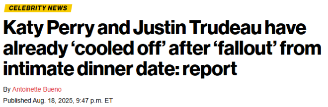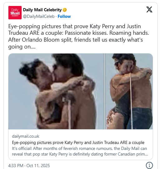 据《星期日邮报》报道,加拿大前总理贾斯廷·特鲁多(Justin Trudeau)与流行歌手水果姐凯蒂·佩里(Katy Perry)被拍到在加州海岸外的佩里游艇上接吻、拥抱。 ![]() ![]() 图源:Page Six 该游客在接受《星期日邮报》采访时表示:“佩里的船靠近一艘公众观鲸船后,两人就开始亲吻。我一开始没认出那是谁,直到看到那名男子手臂上的纹身,我立刻意识到那是贾斯廷·杜鲁多。” 杜鲁多的左肩上有一个海达族(Haida)渡鸦纹身。 ![]() 图源:nationalpost 关于佩里与杜鲁多之间关系的猜测已流传数月。今年7月,二人曾被目击在蒙特利尔的Le Violon餐厅共进晚餐,引发外界关于两人恋情的传闻,最早由TMZ报道。 该餐厅当时在7月向《国家邮报》表示:“凯蒂和贾斯廷都非常友好、温暖,对员工也很有礼貌。” 杜鲁多与妻子苏菲·格雷瓜尔(Sophie Grégoire)在2023年结束18年婚姻,而佩里则于今年7月与演员奥兰多·布鲁姆(Orlando Bloom)分手。 ![]() ![]() 社交媒体有人写道:"贾斯汀·特鲁多到底是什么人?他甚至对妻子和孩子都不真诚。赶紧离开这个被他弄得支离破碎的国家吧。真不要脸。” “所有投票给自由党的人,现在感觉怎么样?他根本不在乎加拿大,”有人这样评论特鲁多。 爆料! 杜鲁多新恋情: 两人擦出火花!![]() ![]() 图源:Page Six 一位知情人士告诉媒体Daily Mail:“她很忙,他也很忙。两人曾在7月份“不停地”发短信。他们有很多事情要做,但新鲜感已经消退了。” “但这并没有什么不好,”这位知情人士继续说道。“他们只是不再经常联系了。这种情况可能会改变,但就目前而言,情况就是这样。他们的关系已经冷却了。” “我知道杜鲁多对照片曝光并不高兴,”消息人士说。“这只是第一次约会。第一次约会!这些照片曝光后,就成了一件大事,这似乎不是他想要的。” ![]() 图源:Daily Mail 知情人士指出,杜鲁多“没有准备好”与凯蒂约会后引发的关注。 “这可能会让人应接不暇,甚至不知所措,”知情人士解释道。 另一位知情人士透露,目前,凯蒂和杜鲁多只是朋友。 “她现在还没有准备好开始约会,她必须继续专注于治愈与奥兰多分手后的伤痛,”知情人士说。 ![]() ![]() 图源: Stefanie Keenan/Getty; Thierry Monasse/Getty 另据PEOPLE独家报道,一位知情人透露了这位《Firework》主唱与杜鲁多的关系走向。今年7月底,他们曾被拍到在蒙特利尔一起共进晚餐。 ![]() 图源:TMZ 消息人士称:“他们只是随意地约出来第一次见面,算是互相了解一下。虽然两人有不少共同兴趣,也有很多话题可以聊,但目前恋爱并不是她的重点。凯蒂和杜鲁多还保持着联系,不过暂时没有再次见面的安排。” 7月28日(周一),现年40岁的凯蒂和53岁的杜鲁多被拍到先遛狗,之后一起去蒙特利尔餐厅Le Violon用餐。餐厅主厨曾透露:“他们度过了一个非常愉快的夜晚。两人对员工都很友好有礼,我们很荣幸能接待他们。” 两天后,7月30日,杜鲁多又出现在凯蒂在蒙特利尔Bell Centre的演唱会上。 ![]() 图源:TikTok@avocado6713 8月初,另一位加拿大知情人表示,两人之间有一种“瞬间的连结”。 消息人士当时说:“他们确实彼此有好感,但还需要时间看看会发展到哪一步。她正在全球巡演,他则在卸任总理后重新规划自己的生活。但他们之间是有吸引力的,而且有很多共同点。” ![]() 图源:Swan Gallet/WWD via Getty 另一方面,凯蒂与英国演员奥兰多·布鲁姆(Orlando Bloom)的感情在今年7月初画上句号。两人曾断断续续交往多年,甚至订过婚,但最终还是分手了。两人的经纪人表示,他们这几个月已逐渐将关系转向以共同抚养女儿Daisy Dove为重。小女孩将在8月26日迎来5岁生日。 ![]() 图源:BlayzenPhotos 杜鲁多与妻子苏菲(Sophie Grégoire)则是在2023年8月宣布结束 18 年的婚姻。两人育有三个孩子:大儿子Xavier、小儿子Hadrien,以及女儿Ella-Grace。 ![]() 图源:Kamara Morozuk/Bloomberg via Getty 目前,凯蒂正在进行Lifetimes世界巡演,这是为了宣传她的新专辑《143》,也会演唱职业生涯中的一些代表作。8月她会继续在美国演出,秋季则会去布宜诺斯艾利斯、伦敦、贝尔法斯特、柏林、巴黎和东京等地。巡演将在今年12月阿布扎比收官。 |