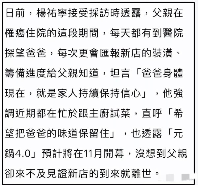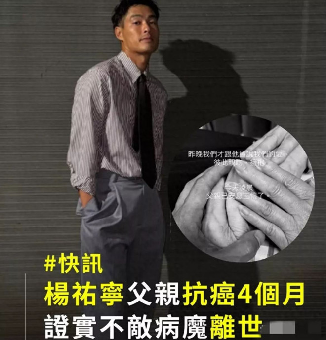 10月12日,知名男星杨祐宁发布噩耗,宣布其父亲于当日凌晨离世,享年71岁。 杨祐宁近期在热播电视剧《灼灼韶华》中饰演“闻知秋”一角,但在新剧播出期间,他一直守候在医院陪伴年迈的父亲治疗。 ![]() 据杨祐宁透露,今年6月,父亲被查出患上恶性肿瘤。起初只是肾脏发炎和尿道结石,随后出现腹胀和水肿症状,最终确诊为恶性肿瘤并伴有转移。发现病情后,杨祐宁第一时间将父亲送往医院接受治疗。 今年8月30日,杨祐宁还分享了自己43岁的生日照,照片中他依旧在医院陪伴父亲,共度生日。拍摄当天,杨父尚插着呼吸管,半躺在儿子怀中,精神状态看上去还算尚可。杨父身形高大,气质儒雅帅气。 ![]() 从6月确诊到10月不幸离世,杨父仅与病魔抗争了短短四个月,病情之凶险可见一斑。杨祐宁随后发布了与父亲的最后合照,画面中全家紧紧相握双手。他感慨道,昨晚还与父亲诉说爱意,父子间拥抱亲吻,没想到翌日便传来噩耗,令人痛心。 ![]() 这两个月对杨祐宁来说格外艰难:妻子怀着第三胎进入孕晚期,父亲病重缠身。9月12日,他刚刚公布三胎降生的喜讯,仅一个月后父亲便撒手人寰,巨大的压力让他应接不暇。 ![]() 杨祐宁的父亲杨进元在台湾颇有名气,是一位美食家并创立了自己的火锅品牌,吸引了众多明星成为常客。儿子杨祐宁也一直积极协助管理其餐饮事业,品牌已初具规模。可惜天不遂人愿,杨父在确诊癌症前一个月才宣布退休,或许也是因身体状况逐渐恶化所致。 ![]() 父子情深似兄似父。杨祐宁在父亲治疗期间每天探望,还兼顾火锅店经营,表现出极强的责任感和孝心。 近年来,凭借《灼灼韶华》的热播,杨祐宁的知名度和人气大增,并顺利迎来三胎宝宝,事业与家庭皆有起色。然而在此关键时刻失去父亲,无疑给他带来沉重打击。 ![]() 世事无常,愿我们都能珍惜当下,守护身边的亲人 |