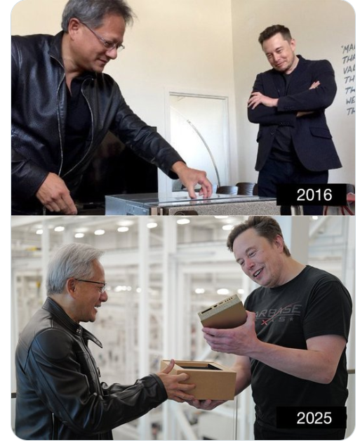 当地时间10月16日,英伟达公司发布了一段视频,显示了他们的总裁黄仁勋和SpaceX总裁埃隆·马斯克的互动。 据悉,视频拍摄于SpaceX的Starbase火箭工厂,“皮衣黄”把公司的新产品“DGX Spark”交到了世界首富的手中。两人站在工厂高台上,俯瞰火箭组装线,氛围很是轻松。 黄仁勋跟马斯克解释说,这次带来的“DGX Spark”,是一台桌面级的超级计算机,性能是“DGX-1”的五倍。 时光转回到9年前,当时黄仁勋也给马斯克送一台超级计算机,也就是“DGX-1”。比起一手便能拿起的“DGX Spark”,那个东西就显得太大了,只能放在桌子上,不过在当时,那样的一台计算机已经是很先进了。 当时黄仁勋给马斯克的是全球首台“DGX-1”AI超级计算机,价值12.9万美元。彼时马斯克还是OpenAI的联合创始人,他主导非营利AI研究,旨在对抗谷歌的AI垄断。 而这一次黄仁勋带给马斯克的“DGX Spark”,是九年前“DGX-1”的升级版,虽然体积缩小成了书本的大小,但性能却提升了5倍。 ![]() ![]() ![]() ![]() 从英伟达公布的视频来看,黄仁勋和马斯克就如同老朋友一般,交谈时很是亲切,他们强调了AI在SpaceX的未来应用,却也没有聊商业细节。 ![]() 两位科技巨头的互动显然引发了很多的关注,而不少人也注意到,九年的时间里,“现实版钢铁侠”的体型也是发生了明显的变化。和没有什么明显变化的黄仁勋站在一起,他似乎过于“大块头”了,为此也有人调侃说:“计算机越来越小了,他却越发巨大了” 据称,马斯克在过去的九年时间里,体型的确发生了不小的改变,最明显的就是体重增加了。九年前他的体重约为170斤,配合他1米88的身高,还是挺标准的,也让他看着有些瘦长。 但现在他的体重已经涨到200多斤了,而且胸部明显“膨胀”,为此很多人称他看起来很奇怪,甚至还有了马斯克是否服用了“人类生长激素”(HGH)的猜测。据称HGH常用于抗衰老,但副作用包括体重增加和体型异常。 ![]() 马斯克曾公开承认过自己的“发福”,他说:“我胖了,现在是圣诞老人级健壮(Santa outfit)。”与此同时也有很多评论认为,马斯克的确“变帅了”,却也不认为这是自然发展出来的,而是“减肥神药”+面部紧致手术+植发促成的。 显然,虽然马斯克睡眠时间有限,同时也缺乏运动,但他也是渴望有一个良好的个人形象的。 |