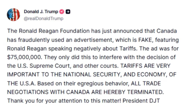 美国总统特朗普表示,鉴于安省政府发布了一则使用美国前总统罗纳德·里根(Ronald Reagan)声音的反关税广告,他决定终止与加拿大的贸易谈判。 ![]() 图源:CTV 特朗普周四深夜在Truth Social发文称:“里根基金会刚刚宣布,加拿大在广告中欺诈性地使用了一段‘虚假的’里根发言,内容是批评关税。” ![]() 他写道:“关税对美国的国家安全和经济极其重要。鉴于他们这种极端恶劣的行为,所有与加拿大的贸易谈判即刻终止。” 周四,罗纳德·里根基金会在X平台发文称,该广告“曲解”了里根1987年4月一次关于自由与公平贸易的广播讲话,并表示“安省政府既未寻求,也未获得使用或编辑这段讲话的许可”。 不过,广告中引用的内容确实与里根原话一致。里根在当时的讲话中阐述了对自由贸易的支持,并解释美国对日本半导体产品加征关税是为了回应日本违反贸易协议的行为。 ![]() 里根在讲话中说:“高关税必然导致外国的报复,引发激烈的贸易战。结果就是越来越多的关税、更高的贸易壁垒和越来越少的竞争。很快,由于关税人为推高价格、补贴低效和管理不善,人们停止购买。接着最糟糕的情况发生——市场萎缩、崩溃,企业停产,数百万人失业。” 后来,里根与加拿大前进步保守党总理布莱恩·马尔罗尼(Brian Mulroney)于1988年签署了《加美自由贸易协定》。 这则广告本周早些时候引起了特朗普的注意。对此,安省省长福特为广告辩护,称其目的是“将信息传达给美国人,尤其是特朗普的共和党支持地区”。 福特此前表示,这则广告耗资7,500万加元,目前正在美国主要电视网络上播放。 与此同时,加拿大总理卡尼及其内阁与特朗普政府已就贸易问题进行了数月谈判,两国间的贸易战仍在持续。 在谈判过程中,卡尼多次表示,几乎不可能有任何国家能与美国达成“完全零关税”的协议。加拿大的目标是就特定行业(包括钢铁和铝)达成协议。 本周早些时候,当被问及加拿大是否能在本月的APEC峰会前与美国达成行业关税协议时,卡尼回应道:“我们拭目以待。” 当天在安省鲍曼维尔与福特共同出席记者会时,卡尼表示,美国正在转向“分行业而非全球性”的谈判模式。 卡尼说:“我们目前与美国的谈判是非常具体、详细且建设性的,涉及钢铁业、铝业,还有能源行业的部分内容以及其他几个领域。” ![]() 图源:CTV 卡尼计划周五启程前往亚洲,出席下周的东盟和亚太经合组织(APEC)峰会。特朗普也预计将参加APEC会议。 这并非特朗普首次在社交媒体上突然宣布终止与加拿大的谈判。 今年6月,特朗普曾以加拿大实施“有争议的数字服务税”为由,宣布“立即”中止贸易谈判。 CTV新闻已就此事联系了总理办公室和福特办公室以寻求回应。 |