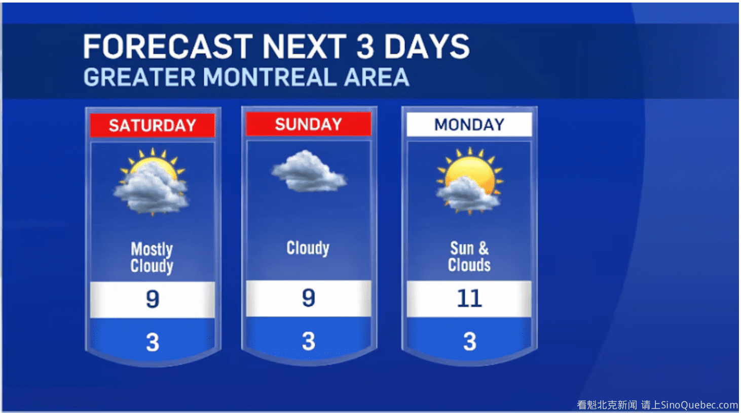蒙特利尔本周末将迎来寒冷天气,最高气温将维持在个位数。周五夜间气温将降至5摄氏度。 周五白天预计为局部多云,至周六下午可能转为阴天,计划在周六晚上外出的市民应注意保暖,届时最低气温约为3摄氏度,体感温度可能接近零度。 周日将以阴天为主,最高气温预计再次升至9摄氏度左右。 周日晚间气温将再次降至约3摄氏度,随后下周白天气温有望回升至两位数。 |