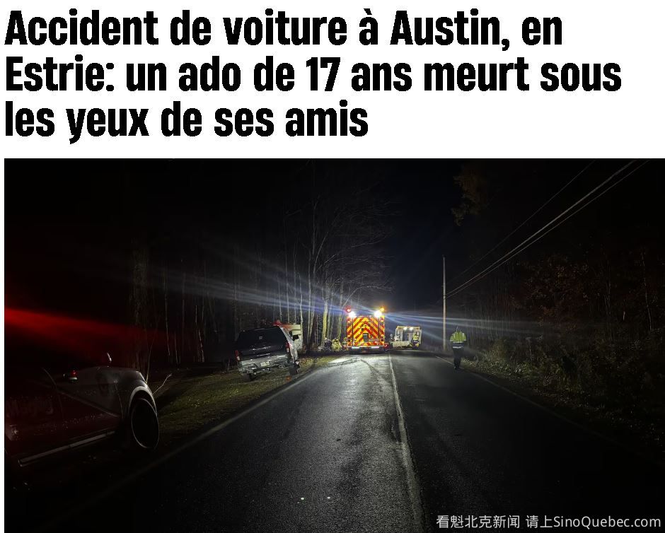 上周六晚上,一名17岁的少年在魁北克省Estrie地区Austin市镇发生的一起车祸中,当着朋友们的面不幸身亡。警方认为,车速过快可能在事故中起了重要作用。 根据今天周一发布的声明,Memphrémagog警察局于当晚8点40分左右接到报警,称Austin的North路上发生一起交通碰撞事故。 警员抵达现场后发现,一辆Subaru汽车在一个弯道出口处失控冲出道路,猛烈撞上一棵树。 事故发生时,车内共有两人。 17岁的驾驶员曾就读于Magog的La Ruche中学(直到去年),他因伤势过重当场身亡。 随车乘客虽无严重伤势,但因受到强烈惊吓被送往医院治疗。 救援人员不得不使用破拆工具将两人从车内救出。 虽然事故的具体原因仍待调查,但当局认为车速过快与事发时湿滑的路面共同导致了这起悲剧。 据悉,事故发生时,这两名少年正被一群朋友的车紧随其后。 La Ruche中学已于今天早晨设立危机干预与心理支援小组,为受这起悲剧影响的学生提供心理辅导。 一名交通事故现场分析专家也已被派往现场,以查明事故的具体情况。 调查仍在进行中。