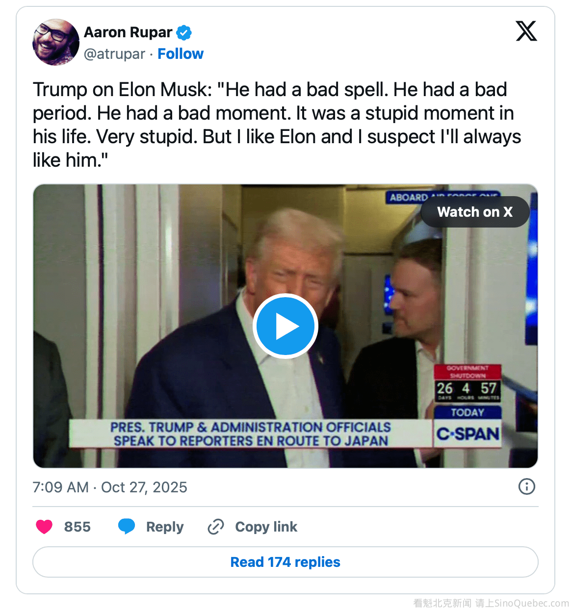 美国总统川普亚洲行来到日本,今(28)日与日本首相高市早苗会面,川普在亚洲行期间持续接受媒体访问,在空军一号上一度被问及与富豪马斯克之间的关系,川普似乎与他冰释前嫌,直言“我喜欢伊隆,我一直都很喜欢他”。 根据商业内幕报导,川普与马斯克之间的争执似乎已有了缓解的迹象,川普在前往日本的空军一号专机上,接受媒体问时透露,尽管马斯克先前做出了一些愚蠢的行为,但他与这位世界首富的关系仍然良好。 川普表示,“我喜欢伊隆,我一直都很喜欢他”,他还表示,自从9月他们在查理·柯克 (Charlie Kirk) 的追悼会上聊天以来,他与马斯克断断续续地聊过一阵子 。 川普提到了两人今年爆发的激烈争执,主要是因马斯克反对“大而美法案”引起,马斯克随后离开了政府效率部。 川普对媒体表达,“他有过一段低谷期,那是一段糟糕的时刻,那是他人生中一段愚蠢的时刻,非常愚蠢。我相信他会这样告诉你。但我喜欢伊隆,我想我会一直喜欢他。” 商业内幕指出,自今年夏天以来,马斯克对川普的批评已经大大减弱,近几个月来,马斯克甚少提及在川普的大而美法案通过后,自己所组成的政党美国党。 不过,马斯克并未减弱批评川普政府成员的力道;运输部长兼美国太空总署(NASA)代理署长达菲(Sean Duffy)近日在受访时暗示马斯克的SpaceX未能履行将美国太空人送上月球的义务,直指SpaceX进度落后,扬言会将合约开放给其他公司,考虑与亚马逊创办人贝佐斯旗下蓝色起源(Blue Origin)签约。马斯克在“X”多次抨击达菲,批达菲为“Sean Dummy”(笨蛋),认为达菲正在想办法害死NASA。 |