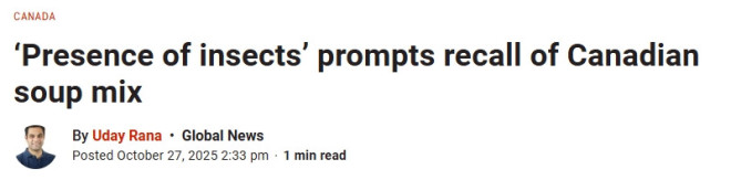 如怀疑因食用被召回产品而出现不适,应及时联系医疗机构。 CFIA指出,过去两周已连续发布多项召回通知,其中包括:因沙门氏菌风险召回的开心果与开心果巧克力产品(上周六);因大肠杆菌风险召回的部分在安省销售的牛肉产品。 Mitchell’s Soup Co. 是加拿大知名即食汤品牌,产品常见于大型连锁超市。此次召回的“咖喱鹰嘴豆炖汤混合料”主要是预包装干货形式,问题源于产品中发现昆虫。 CFIA提醒消费者,务必检查家中库存并遵循召回指引,避免健康风险。 |
