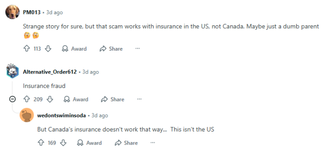 即将进入购物季,出门要小心了!近日,多伦多Costco停车场发生一起离奇事件,当事人在Reddit论坛上发帖曝光,提醒大家在汽车准备发动时,要检查一下车身四周,以免“入局”。 这位网友在帖子里详细记录了事件经过:前几天我在密西沙加的Costco(Dixie & Dundas那家)差点遇到一个新型骗局。 ![]() 图源:Google Reviews 买完东西出来,我走回车旁,看到旁边有一家三口(爸爸、妈妈和一个小女孩)在停车场那边。爸爸留着大胡子,妈妈戴着头巾,小孩看起来是个女孩。我当时以为他们只是路过或者要上车,就没多想。 ![]() 图源:Google Map 我把买的东西装进车里,把购物车推回去,然后上车准备离开——整个过程差不多花了五分钟。结果当我挂倒车档的时候,从后视镜里看到后面居然有人腿在动!(我开的是一辆Lexus掀背车。) 我赶紧踩刹车,下车一看,发现那个妈妈居然把小孩放在我车顶上,正低头给她系鞋带?!我当场就冲他们喊:“你们到底在干什么?明明看到车里有人,怎么能把孩子放到别人车上!” ![]() 示意图 图源:commons.wikimedia.org 那位妈妈只是笑了笑,挥了下手,然后把孩子抱下来。爸爸站在旁边,一言不发,接着他们就慢慢走开了。 事后我越想越不对劲——很可能他们是故意的,想让我倒车的时候“撞到孩子”,然后讹人要赔偿。 最后,这位网友提醒道,大家开车一定要小心!这种套路现在可能也开始在Costco停车场出现了! 在评论区,网友炸开了锅:“怎么会有这么愚蠢的人,为了钱而利用自己的孩子,并可能给他们带来伤害……简直太无语了。” ![]() “我以为他们要么会偷走你刚采购的货,要么更糟——躺在你的车前,假装你把他们撞了!幸好你也没事。看来陌生人危险(Stranger Danger)原则现在也在Costco停车场适用了...” ![]() 不过,有网友指出,碰瓷这招在加拿大行不通:“这事儿确实挺离谱的,不过这种‘碰瓷’套路在美国是为了骗保险,在加拿大一般行不通。也许他们就是单纯的糊涂家长吧。” ![]() 对此,ChatGPT解释道,“碰瓷”在加拿大确实不太容易成功,主要有以下几个原因:1 保险制度不一样 在加拿大,大多数省(像安省、BC省)采用的是一种叫“no-fault insurance”(无过错保险)的制度。这意思是:无论谁的错,每个人的保险公司都负责赔自己那部分损失。 所以“装成被撞”来讹对方,其实拿不到对方的钱,也很难从保险公司那里骗到什么。 2 行车记录仪很普及 很多司机都有dashcam(行车记录仪),一旦录像拍下来,对方想碰瓷基本没戏。加拿大警察和保险公司都非常依赖视频证据。 3 警察介入更严格 如果真的发生“人被撞”的情况,警察会到场调查、看监控、查医疗报告。一旦发现是故意碰瓷,属于刑事诈骗,后果很严重。 4 医疗体系也不支持讹钱 在加拿大医疗是公费的,去医院也不会立刻产生高额账单,所以不像在美国那样能利用“医疗账单”去骗取赔偿。 5 保险公司非常谨慎 加拿大的保险公司系统共享理赔记录,任何“异常索赔”都会被标记和调查。被发现作假,不仅索赔拿不到,还会留下信用污点。 还有网友在查看了发帖人的账号信息后,觉得这个诈骗故事不像是真的: “非常新的账号,帖子历史记录设为隐藏,谨慎的身体描述,没有明确涉及种族,但仍达到了目的,发生了一件荒谬且说不通的事情。是的,这与(前述特征)吻合,这事完全是编造的。” ![]() 总之,不管是真是假,风险高低,临近圣诞,大家在繁忙的商场停车场,还是要留个心眼。 |