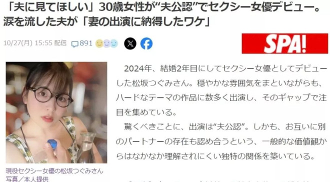 要说日本的婚姻新闻总能刷新三观,这次的故事更是直接把网友看傻。 主角是一位30岁的普通女性,姑且叫她“松坂小姐”。她刚刚结婚两年,却在丈夫“点头同意”的情况下,选择了一个让人跌破眼镜的身份转变——成为成人女演员。 ![]() “松坂小姐”刚刚结婚两年,却在丈夫“点头同意”的情况下,选择成为一名AV女优。(日刊SPA!) 听起来有点荒唐,可如果你走进她的人生背景,就会发现这里头既有无奈,也有某种“活得通透”的执念。 ? 这名松坂小姐原本过着再普通不过的生活:打工、恋爱、结婚 她的气质温和,看上去文静安稳,和“成人女演员”这几个字完全搭不上边。转折点发生在一次手术。她因为骨折动了刀,却在麻醉苏醒时出现了险些窒息的状况——吸得进气,却呼不出来。那一刻,她真切感受到“差点就死在手术台上”。 后来虽然没有生命危险,但她心里留下了强烈的不安: 如果那一刻真的走了,我是不是会有遗憾?是不是有些事还没完成? 而这个“没做完的事”,在她看来,正是她和丈夫婚后几乎没有的性生活。于是,她生出一个想法:通过拍成人视频,把自己当下的身体记录下来,留作一种特别的“遗照”。 ? 有人可能觉得,这是不是一时冲动?其实不然 结婚前,她就在成人用品店打过工,对“裸露”并不排斥。身边还有同学在成人视频制作公司工作,耳濡目染之下,她对这一行业本就有几分好奇。 第一次拍摄时,她也紧张过,但很快就适应了。她说,拍片的过程其实和日常的亲密行为差别不大,只是多了摄像机。甚至,她还慢慢在其中发现了“表演”的乐趣。但并不是所有经历都轻松。比如去年10月的一次拍摄,她要经历极端的场面:通过灌肠注入空气来制造特殊的音效。那次她痛到直喊“快裂开了”,身体疲惫到极点。她后来回忆说,那是自己最痛苦的片场记忆。 ![]() 比如去年10月的一次拍摄,她要经历极端的场面:通过灌肠注入空气来制造特殊的音效。那次她疼到直喊“快裂开了”,身体疲惫到极点。(Youtube@はだかいっかん!) ? 讲到这儿,大家一定会好奇:她老公怎样想的? 最开始,他当然愤怒。婚后本就冷淡的关系,因为她要出道的消息彻底爆发。更残酷的是,松坂小姐还坦白,自己同时有了外遇。丈夫当场哭了。他一方面为妻子和别人发生关系心碎,另一方面也懊悔——他自己差点也走到出轨边缘。 ![]() 松坂小姐还坦白,自己同时有了外遇。丈夫当场哭了。(Youtube@はだかいっかん!) 两人在泪水中争吵、冷静、再争吵。最终,他们得出了一个结论: 如果仅仅因为性问题就离婚,太可惜了 于是,他们做了一个外人难以理解的决定:在性这件事上,彼此自由。松坂小姐很坦然地说,她不嫉妒丈夫可能和别人发生的关系。 他或许会跟别人发生点什么,但我相信他最爱的还是我。只要注意安全,我没问题。 她自己也有三位额外的伴侣。不过她承认,那些关系通常维持不了多久,三个月差不多就淡了。她笑称,那像是一种“预设的恋爱体验”,知道感情会结束,所以在短期内尽情投入。 相比之下,丈夫在她心里是无法替代的: 没有人能让我像对丈夫那样尊敬和深爱。 这样的婚姻模式,看似出格,却让他们的关系意外地稳了下来。过去为性生活冷战的紧张感消失了,他们反而能心平气和地过日子。 ? 别以为他们的生活就全是“猎奇” 实际上两人日常相处得很温馨 丈夫是产品设计师,喜欢数码绘画;她则偏爱用颜料作画。两人会一起去健身房、逛美术馆,偶尔约会吃饭。家里家务分工明确:她做饭打扫,他负责搬重物、清理排气扇。这些细节听上去,和普通夫妻并没有什么不同。 有趣的是,她还希望丈夫能看自己拍的片子。导演甚至把她的真情实感写进了台词。结果,丈夫真的看了。看完后,他大笑:“你这台词念得也太生硬了吧!”面对镜头里的性爱画面,他居然也笑个不停。 松坂小姐说,当时自己既惊讶又感动。惊讶的是丈夫的反应“太奇怪”;感动的是,他是真的在接纳她的选择。 ? 这件事登上杂志后,日本网友们的评论也五花八门: 有人觉得:“别用‘多样性’来掩盖疯狂。这种报道会让年轻人误以为这是一条合理的路。” 也有人感叹:“哪怕普通无奇的人生,也能充满幸福。未必需要靠这种方式去证明自己。” 有位网友说:“我也有无性婚姻,虽然能理解她,但绝不希望这些被拍成作品。因为这样只会加深一部分男性的臆想。” 还有人提醒:“现在成人女演员太多了,作品一旦上传网络,就几乎不可能消失。风险远比过去高。” 我也不懂,我也不敢问,毕竟婚姻这碗饭,吃到嘴里的滋味只有自己知道。所以啊,你们人开心就好,两人锁死吧! ? 更多“松坂小姐”的相片: ![]() ![]() ![]() ![]() ![]() ![]() ![]() |