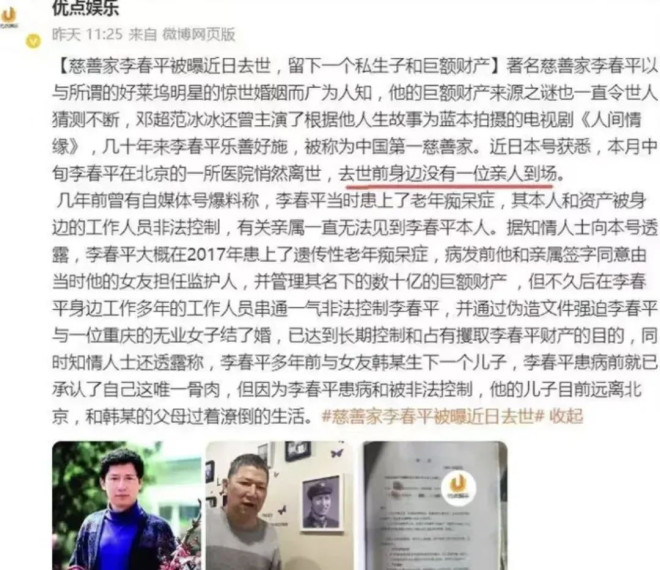 “请你千万不要羡慕我。”——李春平 2025年立冬前,坊间传闻李春平走了。 没有追悼会,没有讣告,没有亲人陪伴。他静悄悄地在北京一家医院离世,像一片落叶,无声无息。不知道这落叶是否提前感知了北京今年冬的寒彻骨。 这位曾经手握百亿财富、中国第一个开劳斯莱斯的“传奇富豪”,最终以最孤独的方式,结束了他荒诞而又悲情的一生。 ![]() 有人说,他的一生像一部电影,从劳教犯到美国富豪遗孀的“儿子情人”,再到中国“百年慈善第一人”,最后沦为被人摆布、签文件、甚至“被结婚”的痴呆老人……直到死后,他的10岁亲儿子还在问外婆:“爸爸到底是活着还是变成星星了?” ![]() 而这一切,都绕不开那笔据传高达268亿的遗产。 李春平,1949年生于江苏淮阴,军人家庭出身。 ![]() 1968年参军,后来调入文工团拉手风琴。1977年转业到北京电影制片厂当保卫干部。 命运的第一次转折,来得很快。 他因与情敌打架,被判三年劳教,开除公职、开除党籍。父亲也与他断绝关系。 那是他人生最灰暗的时期。 走投无路的他,听人劝:“去北京饭店,认识外国人。” 于是,他穿着借来的西装,每天坐在北京饭店的咖啡厅,“守株待兔”。 ![]() 他等来的,是一位比他大39岁的好莱坞女星。 老太太说,他长得像她的初恋。她梦见在中国找到终身伴侣,要带他去美国。 李春平犹豫过,先去英国留学打工,却因车祸回国。 最终,在现实面前,他低头了。 1980年,他以“儿子情人”的身份,随老太太赴美。 在美国的11年:是享受,还是煎熬? 在美国,他住进比弗利山庄的豪宅,见识了名流社会。 但光鲜背后,是11年没有自由的生活。 老太太脾气古怪,对他严密监控,甚至安排保镖跟踪。他白天去唐人街洗盘子,晚上回来给她按摩、陪睡。 老太太还对他进行“破产测试”,看他是否真心。 直到她患癌临终前62天,两人才正式结婚。 ![]() 1990年,老太太去世,李春平继承了她90%的遗产: 三栋别墅庄园(包括仿白金汉宫设计的橡树山庄)、西雅图一家房地产公司、梵高、毕加索的四幅油画(估价超10亿美元),大量现金与古董。一夜之间,他从一个“软饭男”,成了百亿富豪。 但这个“遗产神话”从一开始就布满疑云。有人说老太是凯瑟琳·赫本,可赫本1996年才去世;有人猜是卓别林前妻宝莲·高黛,但当年女星根本赚不到268亿。多年后他的亲信隐晦透露:“所有传说的真实度不足40%,那13年根本不是伺候人那么简单。”那他为什么要隐瞒国外的经历,他的巨额财富又来自哪里呢?。 ![]() 1991年,李春平回国,一下飞机就成了京城焦点。 他在华侨村买了仿白金汉宫的豪宅,马桶镶着金边,家里雇了40人的服务团队,包括管家、保镖、三个保姆,连狗都喝法国进口矿泉水。 “穷怕了”的李春平开始用金钱填补空虚。他一次性买了三台劳斯莱斯,车牌号都是连号;澳门赌场成了常去之地,最多一次5天输掉1.4亿,输急了就给朋友打电话哭,挂了电话又换家赌场接着玩。有次街头见乞丐冻得发抖,他当场掏了3万现金,吓得对方以为遇到骗子;1998年抗洪捐210万,非典时捐300万,贵州山区贫困生、北京伤残消防员,只要见了求助信息,动辄几十万地捐。 ![]() 2011年的“30万现金摆病床”事件,让他成了争议焦点。贵州14岁少女患再生障碍性贫血急需手术费,李春平带着30捆百元大钞直奔医院,当着记者的面堆在少女床头。照片曝光后,有人骂他“用钱侮辱人”,他却无所谓:“我没文化,只会用现金救人,总比见死不救强。”截至2016年,他累计捐款超6.3亿,平均每天捐7万,红十字会给他颁了“百年第一人”的奖状。 可这份“慷慨”背后藏着更深的空洞。他在自传《忏悔无门》里写:“这些钱不是我挣的,花出去才踏实。” ![]() 他是中国红十字会授予“慈善家”荣誉的第一人。 民间流传一句话:“有困难,去北京找李春平。” 2015年,66岁的李春平通过试管婴儿,有了一个儿子。 他本想与孩子母亲结婚,却遭身边人阻挠。 他们藏起他的身份证、户口本,打印“年轻女孩骗富豪”的新闻给他看。 2016年冬天,民政局工作人员上门送“慈善楷模”奖状,他握着钢笔在表格上戳出十几个黑点,连自己的名字都写不全。医生在病历上写下:“定向力丧失,阿尔茨海默症中晚期” 嗯,李春平被确诊阿尔茨海默症,智商只有59分。 这时一场围绕他财产的“围猎”正式开始。 ![]() 2016年,他被强行带走25小时,签下一堆合同;工作人员抵押他的资产,贷款2.5亿;一名保姆甚至拿出2017年与李春平的结婚证,企图分产;他的女友和儿子被隔绝在外,连探视都难。 ![]() 他成了各方势力争夺的“道具”,被摆拍、被签约、被结婚。 那个曾经风光无限的慈善家,如今蜷缩在沙发上,嘴角流着口水,眼神空洞。 这场围猎里,李春平成了真正的“木偶”。2021年最后一次医院记录显示,他体重掉到90斤,连吞咽都困难,神经内科主任备注“已进入终末阶段”。可直到2025年“死亡”消息曝光,朝阳法院还堆着30多起相关官司,法官无奈吐槽:“他按手印的速度比我们开庭还快。” ![]() 遗产去哪了?谁又在说谎? 李春平的财富来源,一直是个谜。 他一直对外宣称是好莱坞女星遗产,但很多网友和专业记者比对后发现: 1990年死于乳腺癌的好莱坞女星,几乎没有符合条件的人。且国外的遗产税高达40%,如果真的是继承百亿遗产,必定会有税务历史记录,但却查无实证。 他身边人透露,李春平代号“鬼子姜”,曾涉