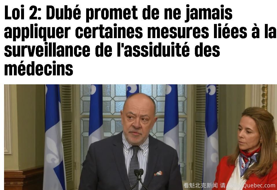 今天魁北克卫生部长Christian Dubé承诺,将永远不会实施2号法案中有关监督医生出勤率的部分措施。 该法原本赋予政府权力,可对未达到特定服务水平的医生进行惩处。 “我们承诺不执行这些措施,”部长 Christian Dubé 表示,并补充称他“倾听了医生的意见”。 不过,这些条款虽然不会被执行,但也不会从法律文本中删除。执业者必须依赖部长的承诺,他保证这些法令永远不会被执行。 Dubé 称这是一次示好举动。 魁北克 希望通过这一承诺,使两大医生联合会重返谈判桌。 这是自特别法案提出以来,卫生部长第三次做出让步,该法案旨在修改医生的薪酬模式。 “我们公开承诺,这一内容永远不会执行,”财政委员会主席 France-Élaine Duranceau 表示,“这是我们为展示诚意、表明倾听态度,以及希望坐下来讨论所做的第三次举措。” 她称这是一次伸出援手,“这不是退让”。 尽管有这些让步,Fédération des médecins spécialistes du Quebec(FMSQ)已表示,如果 2号 法案不被暂停,他们不会重返谈判桌。他们拒绝 Legault 政府的示好。 自由党健康事务发言人 Marc Tanguay 认为 Dubé 部长“方向错误”。 “François Legault 唯一应做的,就是告诉他的部长:‘没问题,我们明白,这不会奏效。我们会按照正确方式行事,暂停法案,以便重返谈判桌。’”他重申道。 魁北克团结党的 Vincent Marissal 表示部长“自作自受”。 “他能力不足以支撑他的野心。他试图强行推进事务,逼急了局面,自作自受,更重要的是,他断了桥梁,”他表示。 |