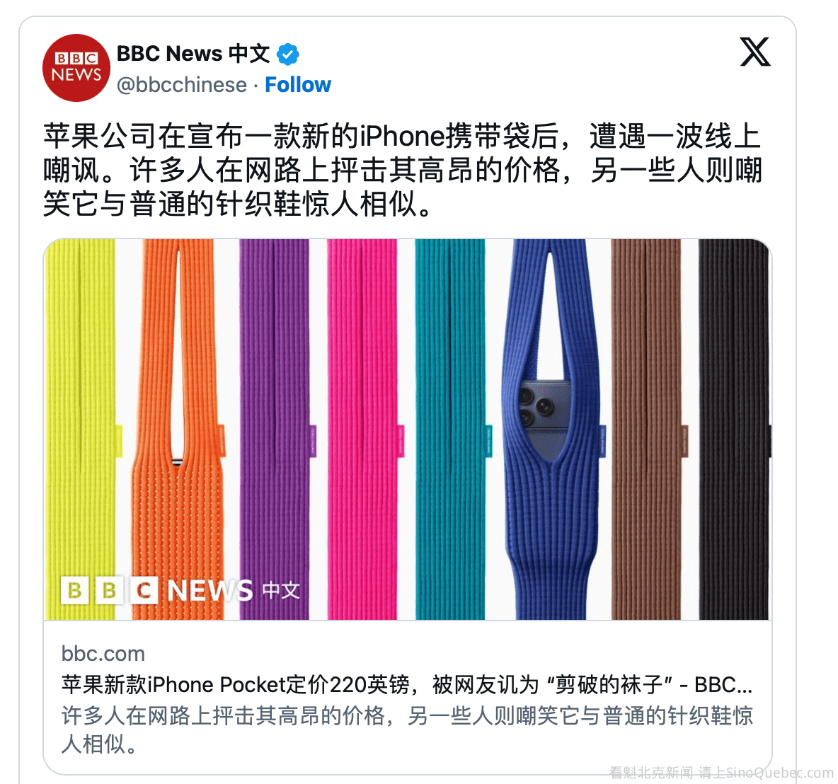 苹果公司在宣布一款新的iPhone 携带袋后,遭遇一波线上嘲讽。 这家美国科技巨头周二公布“iPhone Pocket”,售价为219.95英镑,但它几乎只是携带手机的一种新奇方式,因此引来奚落。 许多人在网路上抨击其高昂价格,另一些人则嘲笑它酷似普通的针织鞋——有一位X用户甚至戏称这是“230美元买一只剪碎的袜子”。 而知名科技YouTuber部落客马奎斯·布朗利(Marques Brownlee)则表示,这可以作为对“苹果粉丝”的“试金石”,看他们是否会“购买或维护苹果发布的任何产品”。 在新闻稿中,苹果表示这款色彩鲜明的配件是与日本时尚品牌“三宅一生”(Issey Miyake)合作推出的限量系列之一。 已故的时尚设计师先前曾与这家科技公司合作,打造了公司联合创始人史蒂夫·乔布斯(Steve Jobs)标志性的黑色高领毛衣。 苹果表示,这款产品的灵感来自“一块布料”,其概念源于“创造一个额外口袋的想法”。 该包款的短肩带设计将提供八种颜色,长肩带则有三种颜色。 “忠诚的边界” 这款包的发布在社交媒体上引发了批评,许多人认为这表明苹果粉丝“什么都愿意付钱”。 这款包的敞口设计和袜状结构也遭到了抨击,一位X平台用户评论道:“没有拉链,没有支撑结构,考虑到现在iPhone被盗的案件如此之多……这安全措施还有什么保障?” 甚至有人恶搞,张贴演员萨夏·巴伦·科恩(Sacha Baron Cohen)饰演虚构角色波拉特(Borat)的照片,暗示该产品与他那件鲜绿色的吊带紧身泳衣相似。 不过,也有人为其辩护,指出价格可能源于与“三宅一生”的合作,称这是“向苹果历史致敬”。 社群媒体顾问兼分析师马特·纳瓦拉(Matt Navara)告诉BBC,这个定价看起来与其说是关于“功能”,不如说是“形式、品牌与独特性”。 他表示:“这类定价在奢侈时尚或设计师联名的世界并不新鲜。” “但对大多数消费者而言,这感觉像是苹果在测试品牌忠诚度的极限。” |