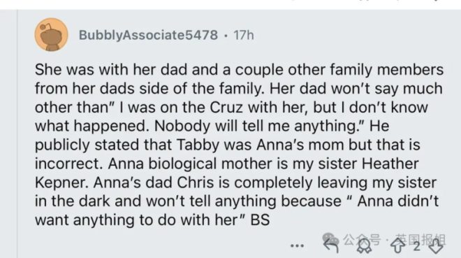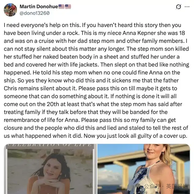 最近,美国一艘嘉年华游轮上发生的一起离奇死亡事件,引发了外网的震动与猜测。 年仅 18 岁的啦啦队队长安娜·开普纳,和家人一起踏上了为期六天的加勒比海度假之旅。 然而,在游轮航行至墨西哥与佛罗里达之间的国际水域时,工作人员清洁舱房,发现了她的尸体——女孩的身体被毯子紧紧包裹,外面又压着救生衣,整个人被塞进床底………… 这起如同“暴风雪山庄”一样的游轮死亡案件,引发强烈关注,FBI第一时间涉入。 她被发现时的状态太过反常,让调查人员第一时间怀疑是凶杀。 此外,同游家人的关系相当复杂,包括亲生父亲、继母、亲弟弟妹妹还有继母带来的孩子们。 更让讨论升温的是,有一名自称是她舅舅的男子在社交媒体发声,公开指责家族内部有人隐瞒真相…… 原本信息匮乏的案件迅速被卷入各种阴谋推测,成为近期美国最受关注的悬案之一。 在其他人口中,安娜是人见人爱的“小太阳”。 她人缘很好,老师和同学们都在称赞她——活泼、开朗、明亮、心地善良,总能让周围的人振奋起来。她是体操队主力、啦啦队队长,存在感很强。 朋友们亲切地称她为“Anna Banana安娜芭娜娜”,说她非常贴心、很会照顾人,非常善于为她人着想。 “如果她去朋友或家人家里,看到水槽里有碗,她一定会自觉去洗,从不求回报。” 与此同时,安娜的成绩也非常好,今年就要从高中毕业,对未来的人生道路有着清晰的规划。 她早早决定高中毕业后参军,之后回到家乡当警察,最好能加入养警犬部门——她一直说自己的愿望是保护别人,让家乡更安全。 不过,过去几个月里,安娜似乎经历了一次失恋。 她最后一条 TikTok 中写道:“我祝愿你幸福,即使你的幸福与我无关。” ![]() ![]() 也许正因为如此,家人决定带她外出散散心。而安娜最喜欢的旅行方式就是坐游轮。 六个月前,她乘坐“嘉年华地平线号”,那时她拍过一条视频,配文写着:“我想再来。” 于是,这一次,她的家人选择陪她再次登上嘉年华地平线号游轮…… 根据报道,这艘“嘉年华地平线号”游轮于2025 年 11 月 2 日从迈阿密出发,开启为期六天的加勒比海航程,预计在11 月 8 日返回。 随行的家庭成员虽未被官方完整披露(尤其涉及未成年人),但从多家媒体与家属公开信息中,大致可以还原同行阵容: 1. 安娜本人 2. 41岁的父亲克里斯托弗 3. 最近刚刚和克里斯托弗结婚的36岁继母香特尔。 4. 安娜一起长大的弟弟妹妹(同父同母或同父异母) 4. 继母香特尔带来的孩子们(外界推测包括 Andrew 与 Timothy,但官方未证实) 根据报道,继母香特尔有三个孩子,其中两个与她同住,这两个孩子很可能与安娜一家共同登船。 11 月 6 日,也就是整个航程的倒数第三天,安娜在晚餐时突然感觉身体不适,于是提前离席,独自返回了自己的舱房休息。 然而第二天清晨,当她父亲召集全家一起吃早餐时,安娜却始终没有出现。 家人一开始以为她睡过头了,但敲门无人应答后。他们在船上各层甲板、泳池区、娱乐设施以及可能她会去的地方反复寻找,却始终一无所获。 直到11 月 7 日上午约 11 点,一名负责清洁的女佣进入安娜的舱房打扫,才意外发现了她的遗体。 根据媒体描述,安娜的遗体被毯子紧紧包裹,外层压着数件救生衣,整个人被塞进床铺底下。 ——这是一个与任何“突发疾病”、“意外摔倒”都毫无相似之处的死亡现场。 在安娜被发现后的数小时,船上的气氛急速紧绷,船员在房间外拉起隔离带,FBI 在船靠岸后立刻登船。 所有乘客被要求提前下船,而家属被集中问话、单独带走记录口供。 父亲克里斯托弗说: “我们一家人当时都在那里。每个人都被盘问了。所有人都下了船。我不知道他们在调查谁,也不知道他们的调查内容是什么、” “联邦调查局目前还没有跟我透露任何信息。我想他们之后会联系我的——但我跟其他人一样,对此一无所知。” “我现在完全不知道发生了什么。我们只能静观其变,等待答案。” ![]() 而面对网上的猜测,安娜的父亲恳求互联网不要打扰他们,安娜的继母则从头到尾都没有发声。 “我不得不把世界隔绝在外。我不再看电视了。我们真的不得不停止接触互联网。“ “我们是非常低调的人,生活被彻底颠覆了。” 最开始,有人认为可能是船上陌生人犯案,但由于死者被塞在舱房床底,这个理论逐渐被认为不太可能。 也有人怀疑安娜可能被船上的工作人员盯上了。 “船上都有监控,能拍到谁进出!为什么需要这么久来断案?” “我打赌是(知道监控位置的)船工。” ![]() “有些工作人员绑架女性并对她们施暴。” “像安娜这样的年轻女性就是船工的目标,很容易在她们的饮料里动手脚,然后把她们藏到船上的某个地方。另外,我不信任船上的一些工作人员。抱歉,但我就是不信任。” ![]() “我猜,很可能是某个船员——她也许跟他有点暧昧。她还年轻,会信任对方,让他进了自己的房间,然后事情就从那里急转直下。 他把她的尸体塞到床底下,可能是想等到合适的时机把她扔到海里。” ![]() 也有一些人则是怀疑安娜的家人。 “看起来她当时并没有和家里其他人住在同一个房间。 她因为觉得不舒服提前离开了晚餐,但直到第二天早上 11 点左右被工作人员发现之前,家里似乎没有任何人在寻找她?” ![]() “太奇怪了,她因为不舒服提前离开晚餐,然而到第二天之前都没有人检查过她的情况?这是什么样的