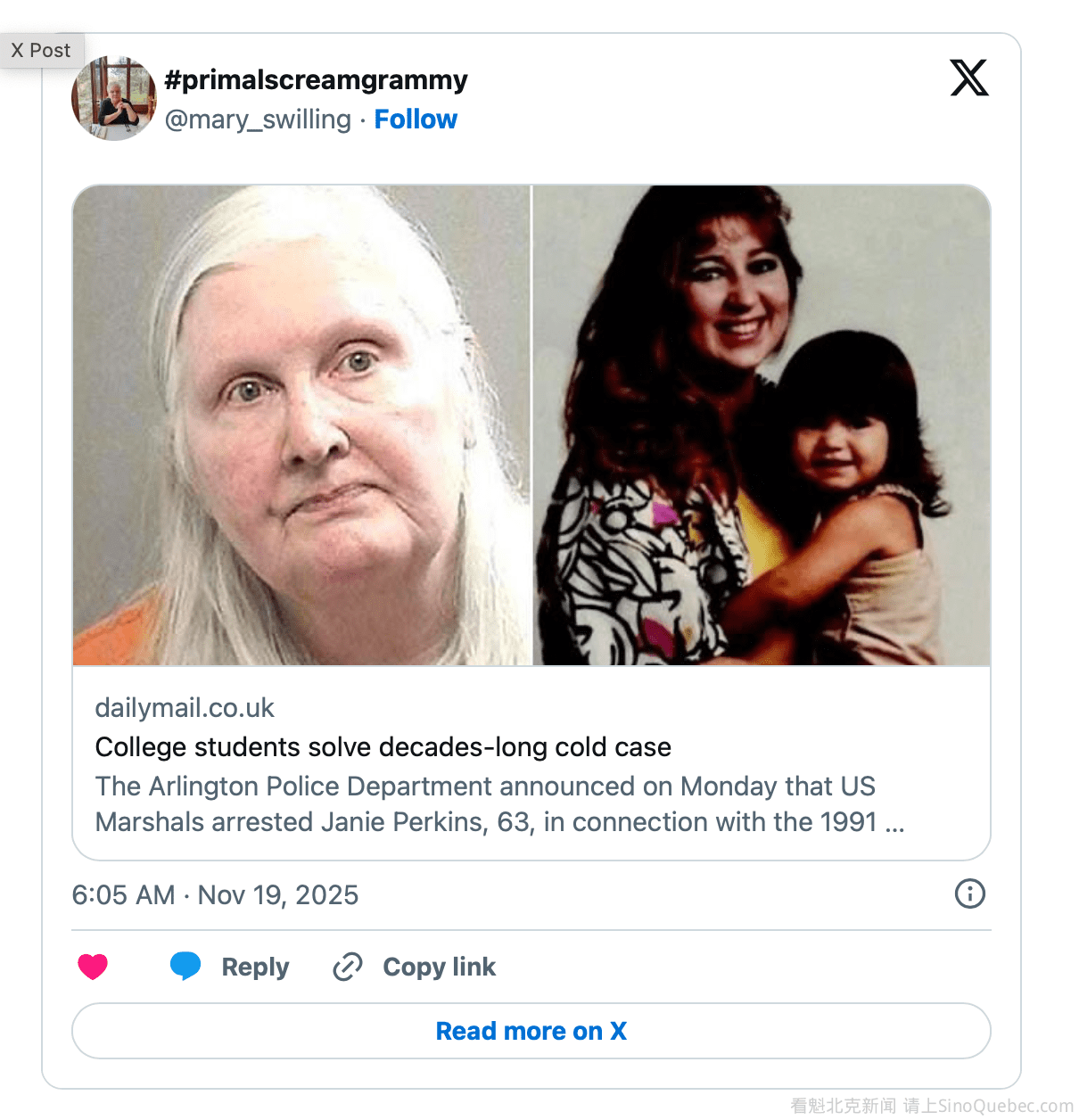 11月6日,法警在德克萨斯州逮捕了63岁的简妮·珀金斯(Janie Perkins),指控她犯有谋杀罪。 可能简妮做梦也想不到,她隐忍了34年,最终却栽在一群大学生的手里…… 这群大学生来自德克萨斯大学阿灵顿分校的犯罪学与刑事司法系,今年秋季学期,他们参加了一个特别的课程。 当地有一些“冷案”,这些案件多年未破,证据逐渐消失。 然而当地警力不足,也没有专门处理冷案的职位,所以警员们只能在工作的间隙处理这些未被破获的谋杀案。 于是警方和学校一拍即合,不如就把这些案子交给这些有时间、脑子又好用的学生们,万一能找到新的思路呢? 于是学校选了15名学生,他们被分成三组,每组负责调查一起冷案。很快,他们就收到了装有大量文件的U盘,其中包含三个案件的所有档案和相关证据。除了物证外,同学们可以接触到调查中的所有信息。 其中一个案件,就是发生在1991年的辛西娅谋杀案。 1991年9月16日,25岁的辛西娅·冈萨雷斯失踪了。辛西娅是一名单亲母亲,从事“成人娱乐”工作。在失踪当天,有人看到她离开家去见一位“客户”。第二天,她的前夫就报案称她失踪了。 在随后的搜寻中,警方发现她的车辆被遗弃在路边,当局开始怀疑她遭到了绑架。9月22日,辛西娅身中数枪的尸体在当地农村的一处私人土地上被发现,当时尸体已经腐烂。 当时警方没有逮捕任何嫌疑人。多年来,警方也收到过一些线索,但直到今年秋季,他们与大学展开合作,学生们加入此案的调查后,警方才得以找到真凶。 小组成员之一的娜塔莉亚表示,他们花了数个月的时间,查阅了500多份案件档案,包括警方记录、实验室报告和证人证词,最终他们锁定了简妮。 事实上,简妮也是警方当年的怀疑对象。早在20世纪90年代,警方就开始怀疑简妮了,她和辛西娅是好朋友,而且共同拥有一个伴侣。 就在辛西娅被杀的几周前,两人的伴侣突然提出要跟简妮分手,他想只跟辛西娅在一起。 辛西娅被杀后,警方也问询过简妮。她没法提供辛西娅失踪当晚的不在场证明,而且当被问及“是否知道谁应该对辛西娅的死亡和失踪负责”时,她两次自愿接受的测谎也均未通过。 她甚至告诉警察,她很高兴辛西娅死了,她之前甚至想过自己动手或买凶做掉她。 动机是有了,可警方没有证据,因为测谎结果并不准确,不能当作正式的证据。警方始终没找到实际证据将简妮与此案联系起来,所以最终也没能对她提出指控。 后来,警方确实陆陆续续收到了一些新线索。可前文也说过,当地警局人手不足,他们没能力大规模重启此案的调查。 去年警方倒是派几个警员,但他们也只能趁着处理其它案件的间隙去调查,最终得出结论——新证据不足,调查也不了了之。 但大学生就不一样了,他们有的是时间和精力彻查案卷。 很快,他们就发现了一份新的证人证词,这些证词称简妮曾在私下里承认自己参与了谋杀,而且她还提供了一些具体细节可供核实。 学生们将证词和案件证据进行了比对,发现两者吻合,这下他们终于找到指控简妮的证据了。 最终在11月6日,简妮在德克萨斯州被美国法警逮捕,并被控犯有一项一级谋杀罪。 当天早上,当地警局负责人来到学校,他召集了参与特别课程的同学们宣布道:“今天早上,我已经写好并签发了逮捕令。我们的美国法警特遣队目前正在德克萨斯州阿兹勒的简妮家外,等待将她逮捕!” 消息传来,全班同学鼓掌欢呼,甚至有几名参与调查的成员热泪盈眶。 之后,简妮被关押在塔兰特县监狱,随后以15万美元的保释金获释。 当地警察局局长发声明感谢这些学生们的努力,他表示:“当我们与学校展开冷案合作时,我们一直希望有朝一日能取得这样的结果。但我们谁也没想到,第一次就会发生这样的事。感谢同学们为这个案件所作的工作和奉献。” 同样感激同学们的还有死者辛西娅的女儿杰西卡,当年她妈妈遇害时,她只有6岁。 杰西卡说,直到几周前,她才知道有一群学生正在帮警方查案。当时的她并不知道母亲的案子就在其中,直到警方联系她,告知他们已经逮捕了嫌疑人。 她在新闻发布会上表示:“我非常感谢这个项目,我为这些学生感到骄傲,非常感谢他们在这个案件中投入的时间和精力。” 她说当她得知凶手被逮捕的消息时,她感到不知所措,震惊、兴奋,各种情绪交织在一起。她听说过简妮这个人,她知道她是妈妈的朋友,但她并不认识她本人。 “我感到震惊,这么亲近的人居然会做出这样的事。” 如今,困扰小镇长达34年的谜团终于解开了,这段经历也对同学们产生了深远的影响。 参与了探案的大四学生艾丽莎将于12月毕业,在这次探案后,她也坚定了自己从事执法工作并成为一名侦探的决心。 她说她很高兴自己能帮死者的家属走出困境,这正是她选择这个领域的原因,“我很感激我们能为她做这件事。” 当然了,抛开这一切意义都不谈。就说在这样的年纪能破获一起困扰了警方几十年的悬案,对于这些孩子来说,这大概是做梦都不敢想的爽剧体验吧…… |