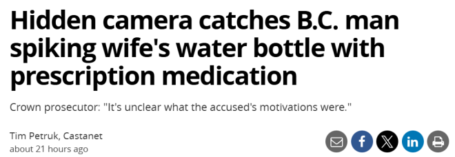 据Catanet报道,Kamloops一名女子Rachelle Moores因察觉饮用水味道异常,在卧室内安装隐藏摄像头后,竟拍摄到丈夫向她的水瓶中偷偷投放降压药的画面 ![]() 现年54岁的丈夫Cory Dwayne Crichton的行为于2024年3月被发现。Moores多次饮用卧室水瓶中的水时,都觉得水瓶里的水味道怪怪的。一次两次可能是错觉,但次数多了,她不禁怀疑:是不是有人在水里动了手脚? 为了弄清真相,Moores在3月28日早上7点采取了行动。她在主卧的床头柜上放了一个水瓶,并悄悄架好隐藏摄像头,之后便离开了房间。 监控很快给出了答案。根据检察官Anthony Varesi在法庭上的陈述,当天早上约8点20分,Crichton进入卧室,拿起水瓶停留约22秒后离开。 ![]() 而在接下来的几小时里,他又返回两次,反复拿起、摇晃水瓶,有时还刻意擦拭瓶身,这些举动让人很难不怀疑他的意图。 看完录像后,Moores立即报警。警方随后赶到,将水瓶与录像作为证物带走,并当场将Crichton逮捕。 ![]() 经RCMP检测,水瓶中被掺入了氢氯噻嗪,这是一种治疗高血压和水肿的处方利尿剂,大剂量摄入可能导致头晕、头痛等身体反应。 此案之所以拖延至2025年才正式提起诉讼,是因为实验室检测耗时近一年,完整报告直到2025年3月才最终完成。 Crichton最终在2025年7月21日才被正式控罪。 下药前后的心理后遗症 在还不知道水里究竟被掺入了什么之前,Moores一直处在强烈不安中。 Moores担心事情可能危及生命,甚至立下遗嘱。她在受害者陈述中提到,这起事件让她长期处于紧绷状态——喝水、吃东西都会犹豫,一旦身体稍有不适,便会怀疑是否再次被下药。 虽然没有造成永久性的身体伤害,但回想当时的情况,Moores认为自己在发现问题前就可能遭到过多次下药。 因为Crichton被捕前的几周里,她经历了极度疲劳、掉发、脚部刺痛以及频繁排尿等症状。但他离开家后,这些不适感随即消失。 ![]() 在受害者陈述的结尾,Moores写道:“身体上的难受劲儿是过去了,可一想到他在背地里对我下药,我心里就又怕又堵得慌。” 值得一提的是,目前的指控只针对2024年3月28日那一次被摄像头拍下的下药行为,至于是否曾经多次下药,并没有被列入这次的起诉范围。 动机成谜 警方调查后认为,Crichton虽然往水里下了药,但没有证据表明他想害死Moores。因此,检方只能以较轻的罪名起诉——向他人饮用水中投放有害物质,而不是以蓄意伤害追责。 ![]() 检察官Varesi在法庭上说:“目前无法确定他的真实动机,但行为本身足以对受害者造成困扰” 庭审中,Crichton保持沉默,由辩护律师代表发言。 辩护律师Joe Killoran表示,Crichton在案件初期就选择认罪,并愿意承担法律责任。虽然没有造成实质伤害,这起事件的严重性仍然不容忽视,未来也会对他的生活造成影响。 公开资料显示,Crichton从小在Kamloops长大,曾在上世纪80年代效力于Kamloops Blazers。他的前科不多,但仅有的两次都与Moores有关。 2015年,他因家暴被判一年缓刑;去年,他又因违反警方禁止接触Moores的命令而被定罪,并短暂入狱。 Moores表示,两人2011年开始交往,2017年结婚。而当摄像头拍下他往水瓶里投放药物的当天,这段婚姻也随之走到尽头。 ![]() 八个月的刑罚 Kamloops省级法院法官Chris Balison采纳控辩双方的建议,判处Crichton八个月的有条件刑期,其中前四个月需全天居家监禁,后四个月必须遵守晚9点至早6点的宵禁。 他还需偿付$1767.28元,来补偿Moores因事件产生的心理辅导费用和安装监控的支出。 ![]() 刑期内,Crichton不得接触Moores,禁止饮酒吸毒,不得持有武器,并需按要求向缓刑官报到。 Moores对判决表示满意,认为案件得到了应有的重视。 不过,这段经历留下的阴影仍难以在短时间内平复。伴侣下药的事实本身就是一种难以消化的背叛,也让她在今后的生活中很难再次轻易信任他人。 信息来源:Richmond News, CASTANET |