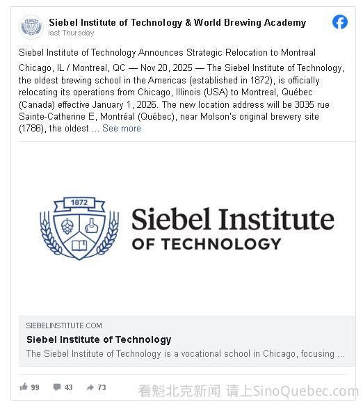 创立于 1872 年的芝加哥 Siebel Institute of Technology 将搬迁到蒙特利尔,原因与美国近期政策变化影响国际学生有关。 学院教育总监 John Hannafan 表示,此举可在不影响学生体验的情况下继续授课。 学院将在 2026 年 1 月结束美国课程,之后正式落户蒙特利尔,新址靠近北美最古老的 Molson 酿酒厂旧址。 芝加哥啤酒界对此颇感惋惜,但蒙特利尔被认为是理想去处。 当地酿酒师 Michael D’Ornellas 称,Siebel 的到来将丰富蒙特利尔的精酿啤酒教育资源,并提升城市作为啤酒目的地的吸引力。 学院表示,蒙特利尔为学生提供安全、文化丰富、设施先进的学习环境,同时拥有繁荣的餐饮与啤酒文化。 Siebel是世界著名的酿酒与啤酒教育机构,专注于啤酒酿造的科学与工艺,包括啤酒配方设计、酿造工艺、质量控制、啤酒评鉴等。该机构学生群体面向全球,国际学生占大多数。