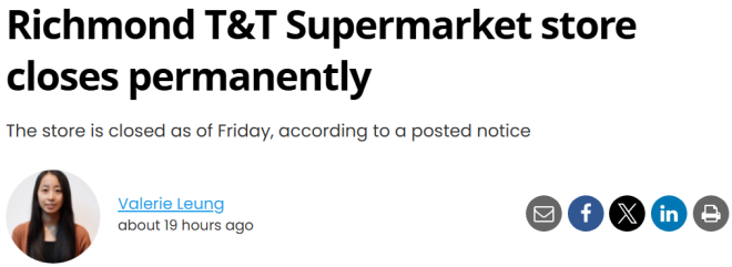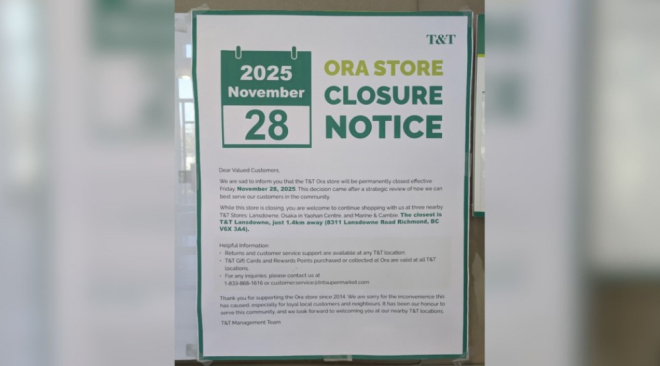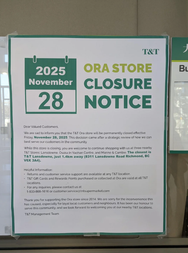 完全、毫无、任何提前预警! 加拿大BC省列治文一间大统华超市(T&T Supermarket)突然永久关门,不少前去买菜的居民当场傻眼。 ![]() 图源:onni.com 本周五,前往Richmond Olympic Oval对街的ORA大统华超市门店的顾客,一到门口就看到一张醒目的通知:门店将于2025年11月28日起永久关闭。 谁也没想到,这家开了10多年的社区超市,说关就关了。 ![]() ![]() 图源:Reddit@ulanob 根据Reddit用户@ulanob发布的照片,公告上清清楚楚写着: “我们遗憾地通知您,T&T ORA门店将于2025年11月28日起永久关闭。此项决定是在我们对如何更好地服务社区顾客进行战略性评估后作出的。” “对于此次关闭为忠实顾客与邻里带来的不便,我们深表歉意。能为这个社区服务是我们的荣幸,也期待在附近的大统华门店继续欢迎您的光临。” ![]() 图源:Reddit@ulanob 大统华总部的一位代表已确认该门店确实关闭,但未提供更多信息。 但最让居民震惊的是,这家店前几天还开得好好的,根本没有任何即将关门的迹象。 Reddit用户ulanob高速Richmond News:“今天有一堆人站在门口一脸困惑,完全不知道发生了什么。” 这家大统华自2014年营业至今,服务周边居民10多年,一直是附近社区最方便的超市。如今突然“熄灯”,确实让不少人心里不是滋味。 |