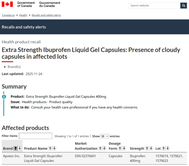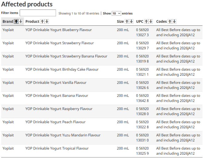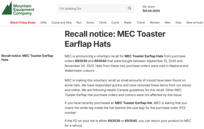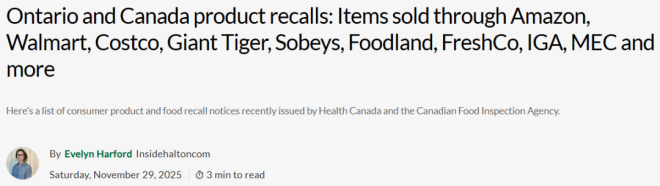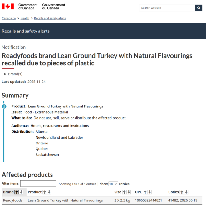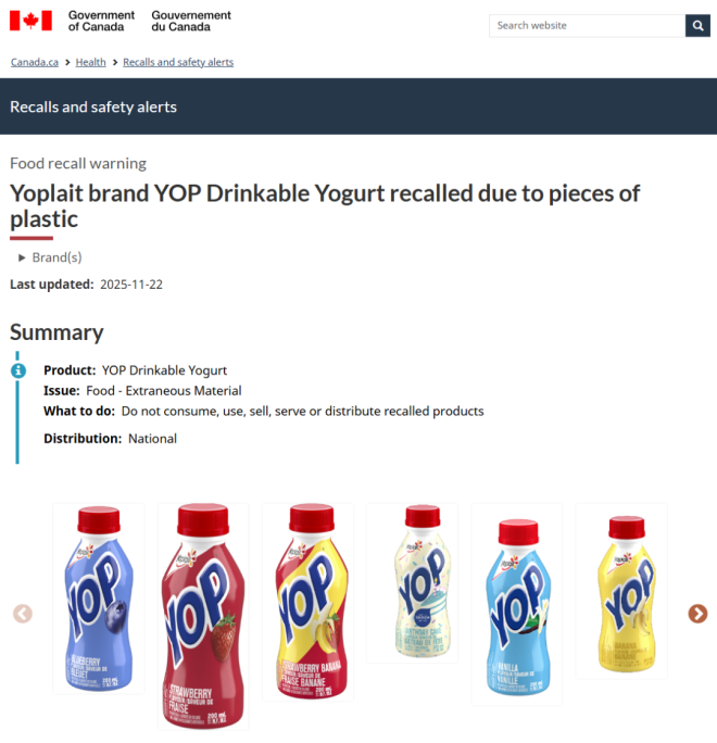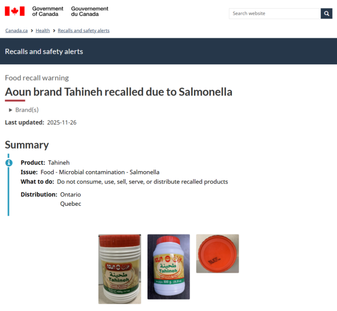 加拿大卫生部(Health Canada)和加拿大食品检验局(CFIA)最近发布了一大波针对消费品和食品的重大召回通知。 如果你经常在Costco、沃尔玛、亚马逊、Sobeys、MEC等知名连锁店购物,赶紧检查你家柜子和冰箱! ![]() ![]() 图源:yorkregion/google 食品类召回 CFIA本周发布多项食品召回通知,包括: 1. 碎火鸡肉 品牌/名称:Readyfoods Lean Ground Turkey 召回原因:可能含塑料碎片 主要销售地点:阿尔伯塔省、纽芬兰与拉布拉多省、安省、魁省和萨省,以及酒店、餐厅和机构 ![]() 2. 芝麻酱(Tahini) 品牌/名称:Aoun Tahineh 召回原因:可能受到沙门氏菌污染 主要销售地点:亚马逊(安省和魁省) ![]() ![]() 3. 花草茶 品牌/名称:Celebration Herbals Senna Leaf Herbal Tea 召回原因:可能受到沙门氏菌污染 主要销售地点:亚马逊(BC省、新不伦瑞克省和安省) ![]() 4. 酸奶饮品 品牌/名称:Yoplait YOP 召回原因:可能含塑料碎片 主要销售地点:Costco, 沃尔玛, 亚马逊, Giant Tiger, 所有Sobeys旗下门店 (如 FreshCo, IGA, Foodland) ![]() ![]() ![]() 消费品/健康产品召回 加拿大卫生部发布多项产品召回通知,涉及: 1. 帽子 品牌/名称:MEC Toaster Earflap Hats耳罩帽 颜色:Neptune(深蓝)、Watermelon(西瓜红) 召回原因:帽子上发少量霉菌 主要销售地点:MEC门店和官网 ![]() 图源:MEC 2. 染发喷雾 品牌/名称:Everpro Gray Away 召回原因:不符合加拿大强制性的产品标签要求,可能对消费者构成潜在危害 主要销售地点:沃尔玛及其他零售商 ![]() 3. 镁补充剂 品牌/名称:MapleLife Magnesium Bisglycinate,200mg 召回原因:特定批次未申报非药用成分氧化镁 ![]() 4. 布洛芬胶囊 品牌/名称:Apotex Extra Strength Ibuprofen,400mg 召回原因:特定批次胶囊出现混浊、结晶沉淀(可能影响药物稳定性) ![]() 持续中的开心果沙门氏菌疫情 迄今为止,加拿大与开心果及含开心果产品相关的沙门氏菌疫情已致117人患病,其中17人住院。 加拿大已暂时禁止从伊朗进口开心果。 此前已发布的食品召回警告涉及在Brampton、Ottawa杂货店销售的开心果、亚马逊售卖的零食、Loblaws与Zehrs超市售卖的蛋糕、糕点、迪拜巧克力等。 受影响的地区包括Mississauga、Oakville、Scarborough、Thornhill、Springwater、Newmarket、Hamilton等地。 此外, 另一起与狗粮和宠物零食相关的沙门氏菌疫情已导致加拿大三个省份和一个地区的32人生病,其中8人住院。 买到召回产品怎么办? 如果你发现自己购买了上述召回产品: