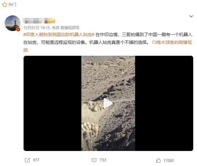 近日,有博主发布视频“印度人疑拍到我国边防机器人站岗”登上热搜。画面可见,在荒无人烟的高原环境中,镜头拉近能看到一个站立姿势的白色机器人。拍摄者疑为印方人员,视频中传出对话及笑声。 ![]() 该博主表示,印度士兵拍摄到了中印边境中国一侧,有一个机器人在站岗,可能是远程监视的设备。据悉,该视频在印度广为流传。 视频在内地社交平台发布后,也引发网友热烈讨论,有网友表示“不用担心有高原反应了”。