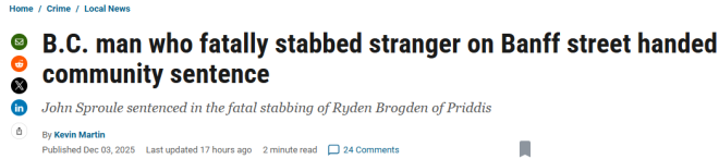 在法官宣判杀害他们亲人的男子不用坐牢后,死者雷登·布罗格登(Ryden Brogden)的几位家属愤然离开法庭。 本周三(12月3日),卡尔加里的一位法官宣布,凶手约翰·斯普劳尔(John Sproule)将接受一项有条件刑期令(conditional sentence order),包括两年的居家软禁。 ![]() ![]() 酒吧监控:左圈是雷登·布罗格登(Ryden Brogden);右圈是约翰·斯普劳尔(John Sproule)图源:法庭文件 23岁的斯普劳尔最初被控二级谋杀(second-degree murder),但今年早些时候,陪审团裁定他犯有过失杀人罪(manslaughter)。他在2022年9月于班夫(Banff)的一家酒吧外,持刀将布罗格登刺死。 但首先发动袭击的是27岁的雷登·布罗格登(Ryden Brogden),他先是推搡并“偷袭”了当时年仅20岁的斯普劳尔,然后继续殴打,将这个年轻人当做“布娃娃”一样拖拽着,一路痛扁。 俩人争执的起因在2022年9月的长周末,来自BC省的斯普劳尔正和家人一起在班夫游玩。周五晚上,他和兄弟在山地小镇上逛酒吧。 与此同时,布罗格登和朋友前往镭温泉(Radium)进行钓鱼之旅,途中在班夫停留。他们也同样在逛酒吧。 斯普劳尔兄弟当时酒后正酣,兴致很高,在不同的场所与顾客和工作人员进行了友好的交谈。 但是,布罗格登和他的朋友在High Rollers酒吧对斯普劳尔兄弟产生了敌意,并向保安提到了他们。然而,斯普劳尔“并没有察觉到”这种敌意。 ![]() High Rollers酒吧 图源:Google Reviews 斯普劳尔最先遭受偷袭两伙人离开High Rollers酒吧后不久,他们在一家现已关闭的Dancing Sasquatch酒吧外面相遇,斯普劳尔想向布罗格登借烟。 布罗格登让他“滚蛋”,然后推了他一把,并偷袭了一拳。 酒吧的监控录像显示了最初的肢体冲突。 布罗格登将斯普劳尔的衬衫拉过他的头,挡住了他的脸,并继续袭击,反复击打他。 ![]() 死者雷登·布罗格登(Ryden Brogden) 图源:Instagram 布罗格登多次说:“我要宰了你”来自附近商家和手机拍摄的视频显示,两人在搏斗,布罗格登将斯普劳尔摔倒在人行道上。 斯普劳尔作证称,布罗格登多次说:“我要宰了你”(I’m going to f--king kill you)。 在布罗格登进行袭击的第40秒,斯普劳尔(当时他的衬衫被拉过头和脸,挡住了视线)掏出一把折叠刀,开始挥舞并刺向他的袭击者。他当时不知道刀刺向了哪里。 两人之间的打斗转移到了一处空置的露台上。此时,一名保安赶到,将布罗格登从斯普劳尔身上拉开,斯普劳尔随后跑开了。 此时,布罗格登已身中12处刺伤和7处利器割伤。 斯普劳尔呈交给陪审团的受伤照片如下图所示。他的脸部、头部、下巴和胸部均有伤口。 ![]() ![]() 被暴力殴打的凶手约翰·斯普劳尔(John Sproule) 图源:法庭文件 法官认为:“他的反应过度了”在事实认定中,国王法庭法官约翰娜·普莱斯(Johanna Price)指出,斯普劳尔被认定是出于自卫,但使用了“超过必要程度的力量”,总共刺伤和割伤了布罗格登先生19次。” 普莱斯法官在周三的量刑判决中说:“这是一起接近于自卫而非接近于谋杀的案件。” “斯普劳尔当时是在自卫……然而,他的反应过度了。” 普莱斯法官形容布罗格登是“一个生命值得珍视的好人”,但她表示,“判斯普劳尔入狱并不能让布罗格登复活。” 普莱斯法官说:“这是一个富有挑战性的案件,我承认,一个人持刀伤人致死却不用坐牢,可能很难让人理解。” 法官接着形容本案的事实属于“特殊情况”(exceptional)。她还指出,斯普劳尔对社区没有危险,并表达了悔意。 240小时社区服务+2年居家软禁布罗格登的家人对于斯普劳尔不用在监狱里服刑表示愤怒和痛苦,在普莱斯法官宣判时,几个人低声抱怨,还有些人则突然离开了法庭。 检控官文斯·平吉托雷(Vince Pingitore)和迈克尔·朗(Mykel Long)要求法官判处五到六年的监禁,而辩护律师科里·威尔逊(Cory Wilson)和马修·布朗(Matthew Browne)则要求两年有条件刑期令或18个月的监禁。 “有条件刑期令”意味着在家服刑。在本案中,斯普劳尔将在家接受24小时软禁两年,并必须完成240小时的社区服务。在他的有条件刑期令完成后,他还将被判两年缓刑(probation)。 普莱斯法官离开法庭后,斯普劳尔拥抱了他的母亲、兄弟和女友。 |