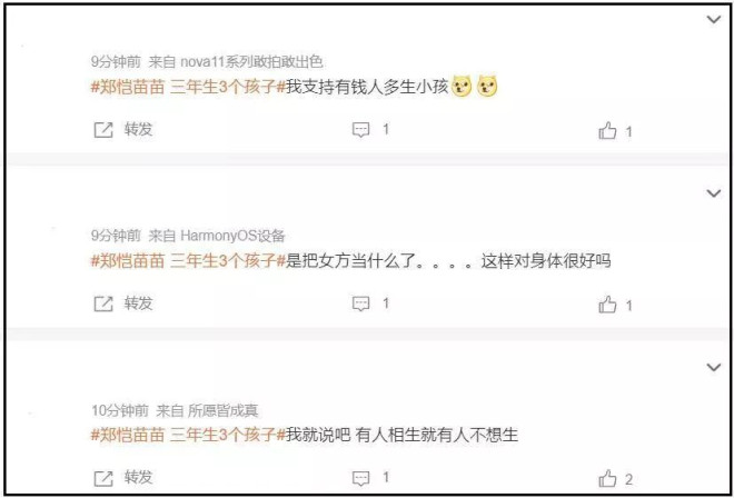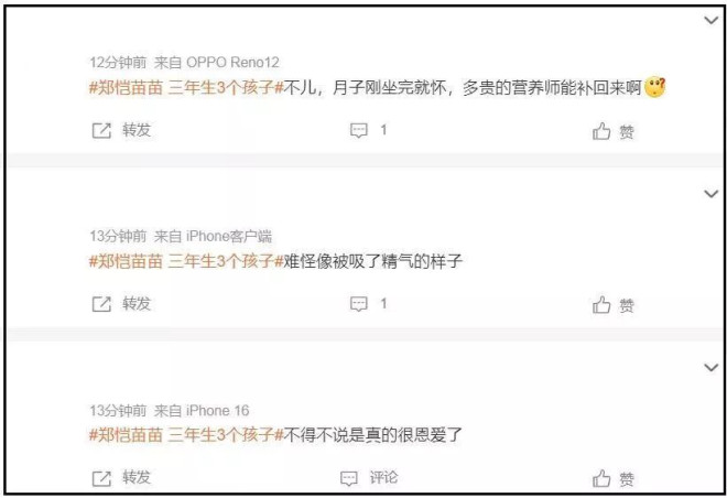 最近郑恺和苗苗夫妻再次登上热搜,二人三年生了三个孩子,连时间线都被扒了出来,只是迄今为止,夫妻俩都没有明确承认三胎的存在,外界讨论起来,每一次都要引发争议。 ![]() 有人觉得郑恺和苗苗婚后恩爱,作为明星收入高还有社会地位,想生几个生几个,都是人家的私事,外人没必要过多置喙; ![]() ——有人觉得就算是明星也无法避免生育损伤,苗苗三年抱三,二胎生了三个月就怀上了三胎,他们自己都自觉理亏不愿公布,外人确实没资格管明星生几胎,但吐槽一下总可以吧? ![]() 这时候还有网友出来爆料,表示自己的朋友在复旦儿科新生儿科,吐槽过郑恺和苗苗夫妻,声称他们在院期间缴费还要一直催。 ![]() 不过之前苗苗被曝生三胎的时候,疑似和她同院生产的孕妇提到了具体医生,并不是在复旦儿科,所以爆料真实性存疑,大家听听就算了。 ![]() ![]() 倒是有一条爆料可以互相验证,就是有人提到苗苗三胎早产臀位开刀,和孕妇口中的“骆医生先给苗苗做手术”的说法对上了。 实际上,网友也不是因为爆料才质疑郑恺和苗苗的,之所以吐槽郑恺的爱妻人设,更多还是因为苗苗三年生了三胎。 ![]() 在网友看来,一个男人若是不顾及妻子身体让她接连生娃,很难相信他是好丈夫,加上郑恺抠门传闻,让人忍不住想问,郑恺对苗苗的爱体现在哪里呢? ![]() ![]() 还有网友为苗苗惋惜,翻出她在电影《芳华》中的独舞片段,感慨当初看电影最喜欢的就是苗苗,结果她早早就嫁人了,还三年生三胎,几乎是放弃了娱乐圈事业。 ![]() 不过从苗苗日常动态看,她还是很享受家庭生活的,只能说每个人的选择不同吧,《芳华》三大女主如今境遇,也是和她们本人的性格有所对应的。 ![]() 2017年,冯小刚导演的电影《芳华》上映,推出了六位新人,分别是苗苗、钟楚曦、杨采钰、李晓峰、王可如、隋源,她们被称之为“芳华六美”。 ![]() 按照影片设定,苗苗是当之无愧的女主角,不过到了戏外就不一样了,钟楚曦、杨采钰靠着张扬的性格和背景,和苗苗一样享受女主待遇。 ![]() 还记得钟楚曦因为抢C位遭到质疑的时候,就有网友扒出她和苗苗上节目多次无视苗苗,而苗苗本人似乎完全没意识到问题,还和钟楚曦友好互动。 ![]() 另外一位杨采钰更是目标明确,她可以不顾争议,和刘亦菲干爹陈金飞谈恋爱,也可以不办婚礼就给豪门二代生孩子。 ![]() ![]() 反观苗苗,她从始至终主体意识不是很强。 ![]() 对待丈夫郑恺,苗苗一向强调是男方引导着她,产后复出参加综艺节目,苗苗干最多的活,其他人想要舒服享受成果,她明知不适合,还是很快放弃坚持,跟随多数人决定。 ![]() ![]() 外界质疑郑恺爱妻人设的同时,某种程度上,忽略了苗苗的选择,都说郑恺抠门,也许苗苗生性节俭呢,都说郑恺不爱护苗苗身体,也许是苗苗希望多生几个孩子呢。 ![]() 另外,不得不提的是,明星夫妻的相处模式有时候不适合普通人做参考,苗苗虽然没怎么拍戏了,但还能靠录制综艺节目赚钱,并非毫无收入,必须承认,就算是做家庭主妇,女明星抗风险能力远比普通女性更强,祝福她们就好啦。 |
