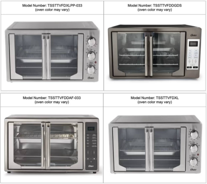 你可以在机器背面或原包装上找到型号。 ![]() 图源:Oster 公告写道:“被召回的烤箱配有弹簧结构的双侧‘法式门’,由玻璃和金属把手组成。四个型号在烹饪功能(例如空气炸)和操作方式(旋钮或数字按键)上有所不同。” “Oster”字样刻在烤箱正面的右下角。你可以前往官网查看自己的产品是否被召回: https://recall.oster.com 如需获取免费的维修套件(含安装说明),你可以在周一到周五,东部时间上午9点到下午5点: