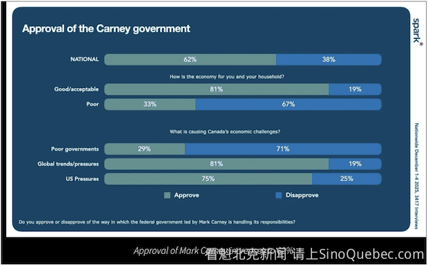 根据 Spark Insights 发布的一项最新民调研究,总理卡尼的支持率目前为 62%,比上一次调查 上升了 3 个百分点。 与此同时,38% 的加拿大人表示不支持卡尼政府。 该研究还显示,如果今天举行大选,加拿大选民整体上更倾向于选择卡尼领导的政府,而不是 Poilievre 领导的政府。